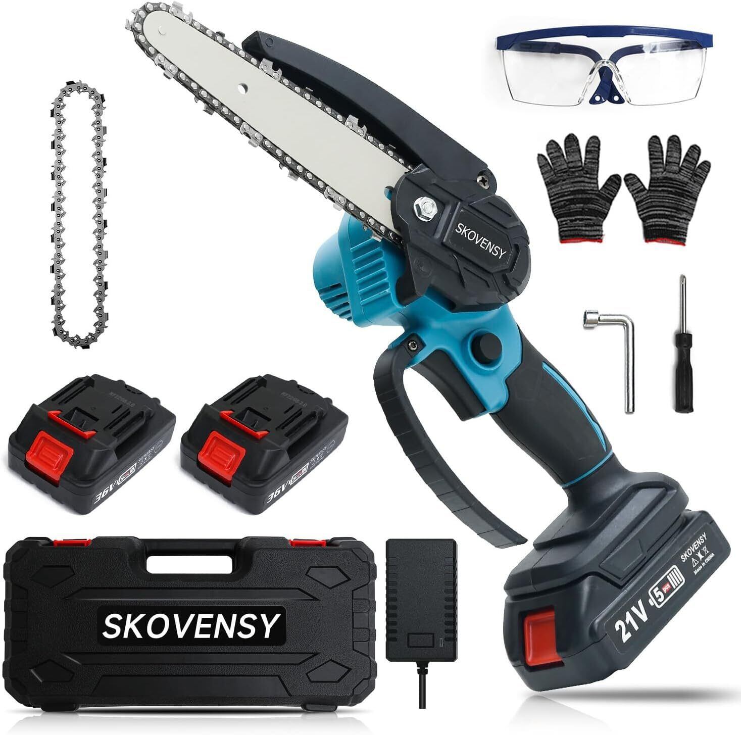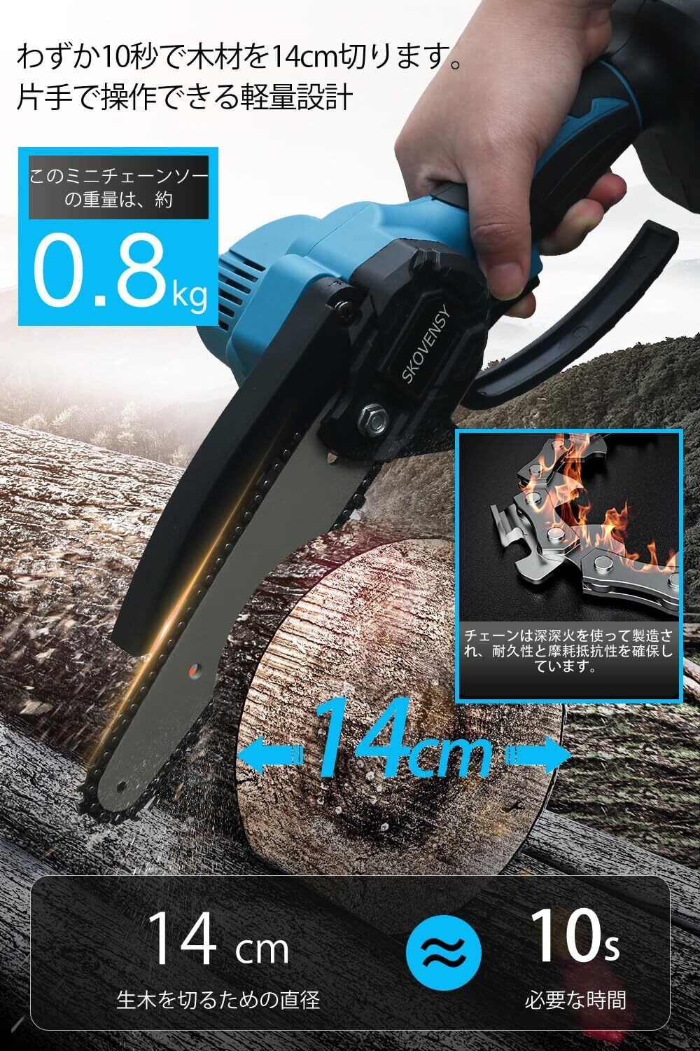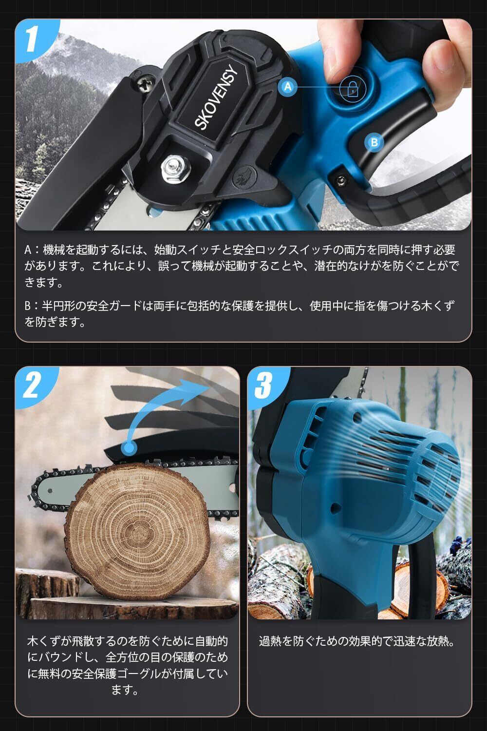 【ワイヤレスで作業可能な大容量電池2個】ワイヤレス使用可能な充電式チェーンソーは、大容量の着脱式電池2個を搭載しています。このチェーンソーは屋外の建設作業に非常に便利で、バッテリーが切れても簡単にできます。この電動チェーンソーには豊富な付属品が付いており、組み立て作業が簡略化され、収納ケースも同梱されています。▲付属品: チェーンソー本体x1、バッテリーx2、充電器x1、収納箱x1、ドライバx1、手袋x1、ゴーグルx1、日本語取扱説明書x1、6インチチェーン1、6インチガイドバー1。ご注意:上記のチェ-ンとガイドバー(サイズはランダム)は1点ずつ本体に装着した状態で発送致します。注意事項:1.連続して10分以上使用する場合は、必ず一度停止し、3分間の休憩を取って機械を冷やしてください。2.バッテリーが完全に充電されていない場合は使用しないでください。そうしないと、バッテリーの寿命が短くなる可能性があります。