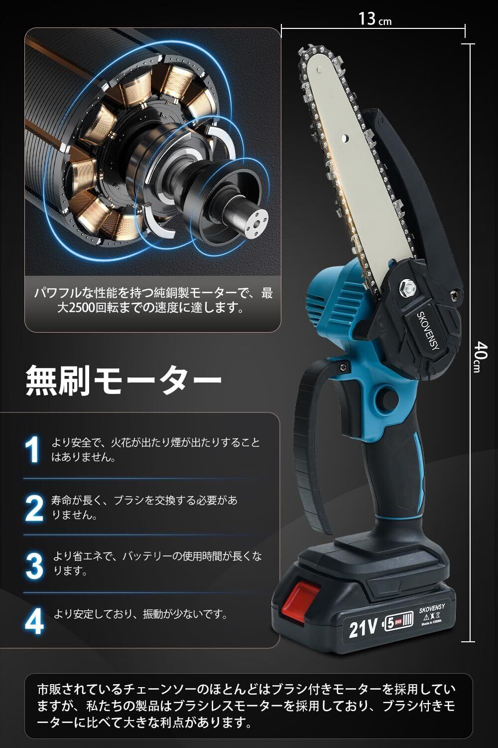 【ブラシレスモーターの優位性】市場で一般的な電動ノコギリはブラシ付きモーターを使用していますが、のこの製品はブラシレスモーターを採用しています。ブラシレスモーターはブラシ付きモーターに比べて多くの利点があります。1-より安全で、火花を発生させず、煙を出しません。2-寿命が長く、ブラシのが不要です。3-より省エネで、1つのバッテリーの使用時間が長持ちします。4-より安定しており、振動が少ないです。