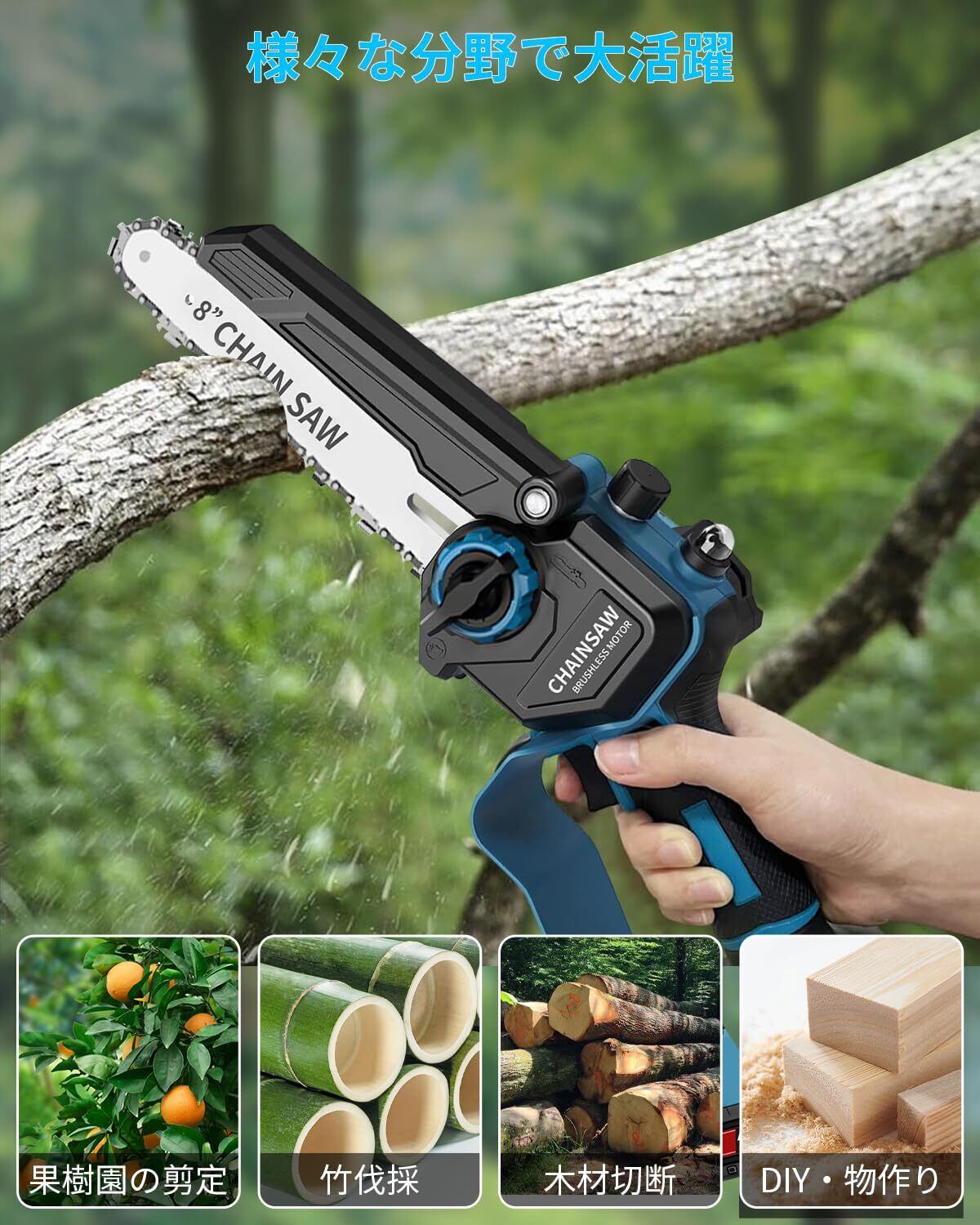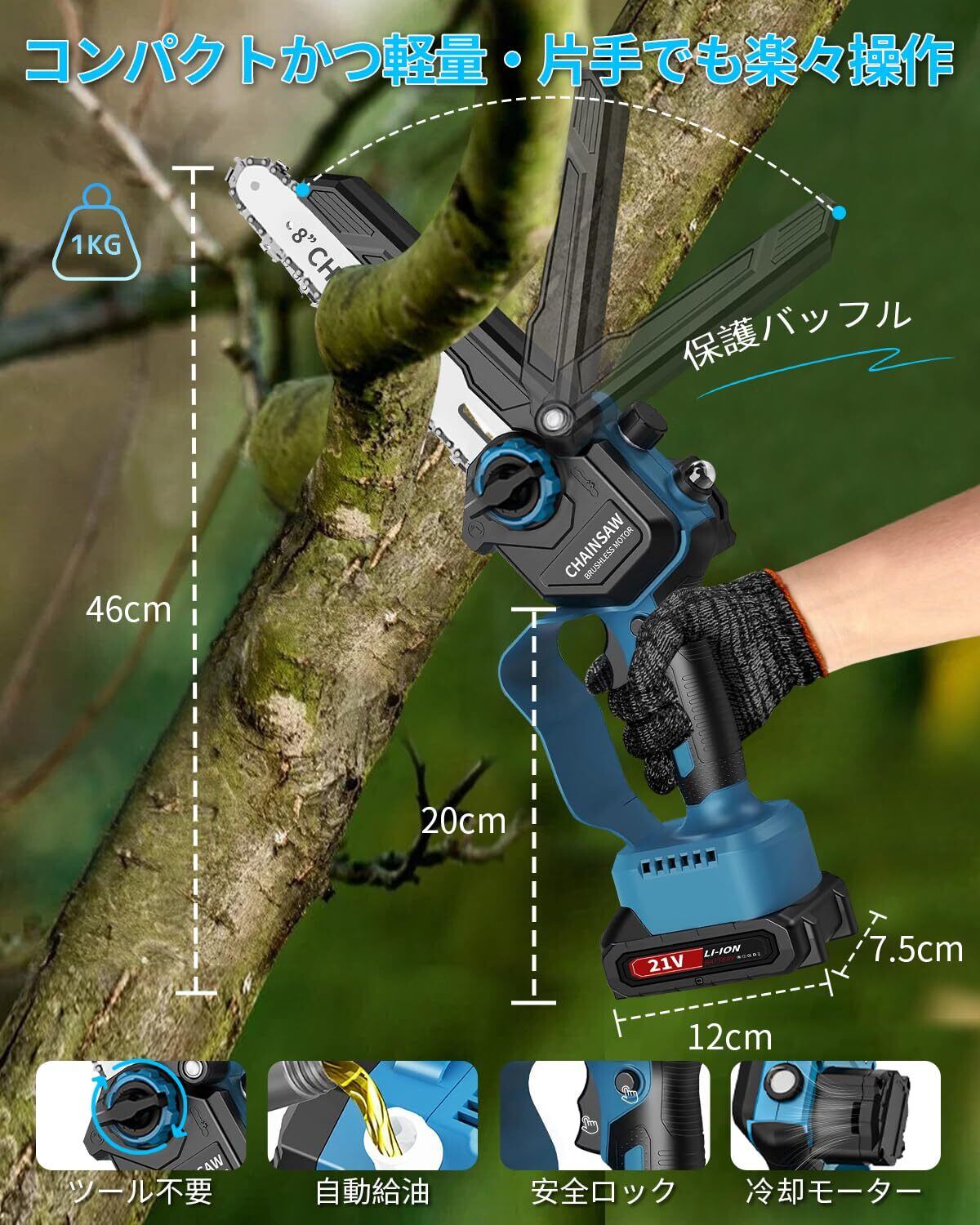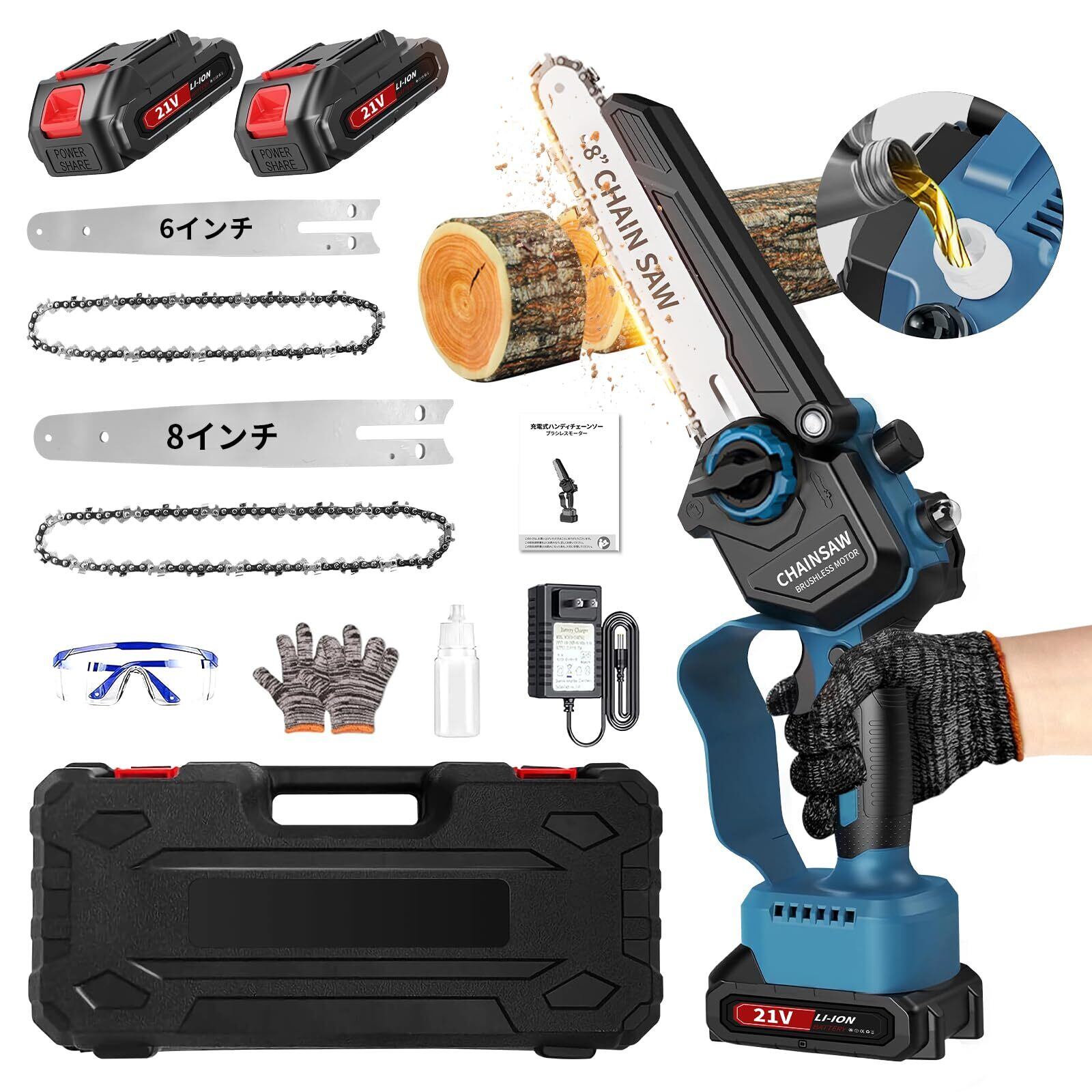 チェーンソー 充電式チェーンソー【2025年最強・9m/sブラシレスモーター・8インチ&6インチ・切断径15-20cm】自動給油ハンディチェーンソー 2個2.0Ahバッテリー 電動チェーンソー 軽量 強力 ミニ 小型チェーンソー ハンドチェーンソー ツール不要 安全ロック コードレス 竹・枝切り 庭木の剪定 薪作り 林業伐採 手袋 ゴーグル ボトル 替え刃 ケース付き 日本語説明書 PSE認証済み