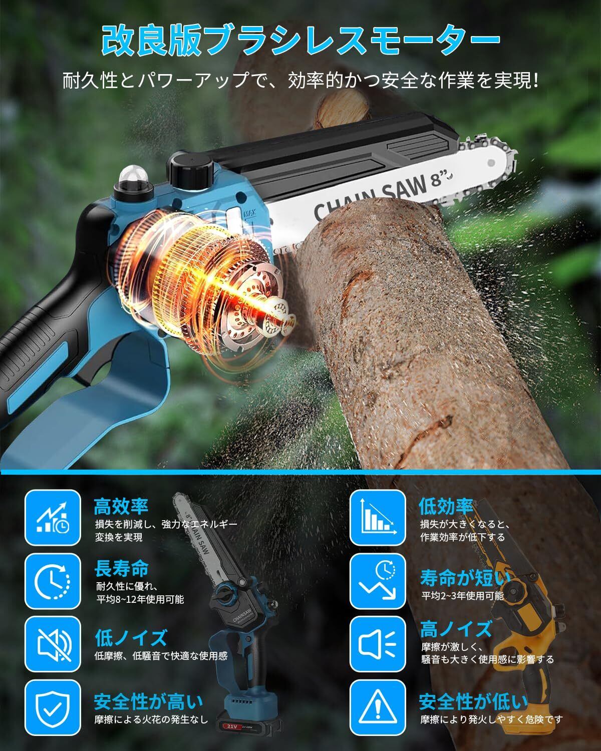 【 高品質ブラシレスモーター 】 充電式チェーンソーはブラシレスモーターを採用し、ブラシのが不要で、強力で効率的な切断を実現します。ブラシレスモーターはブラシモーターに比べて寿命300%、出力電力が80%増加し、エネルギー消費量が60%削減されます。ブラシモーターより速く、より安定して動作しますが、摩耗が少なく、エネルギー消費が低くなります。摩擦による火花の発生なし、スムーズで低ノイズ、効率的な切断で、安全です。