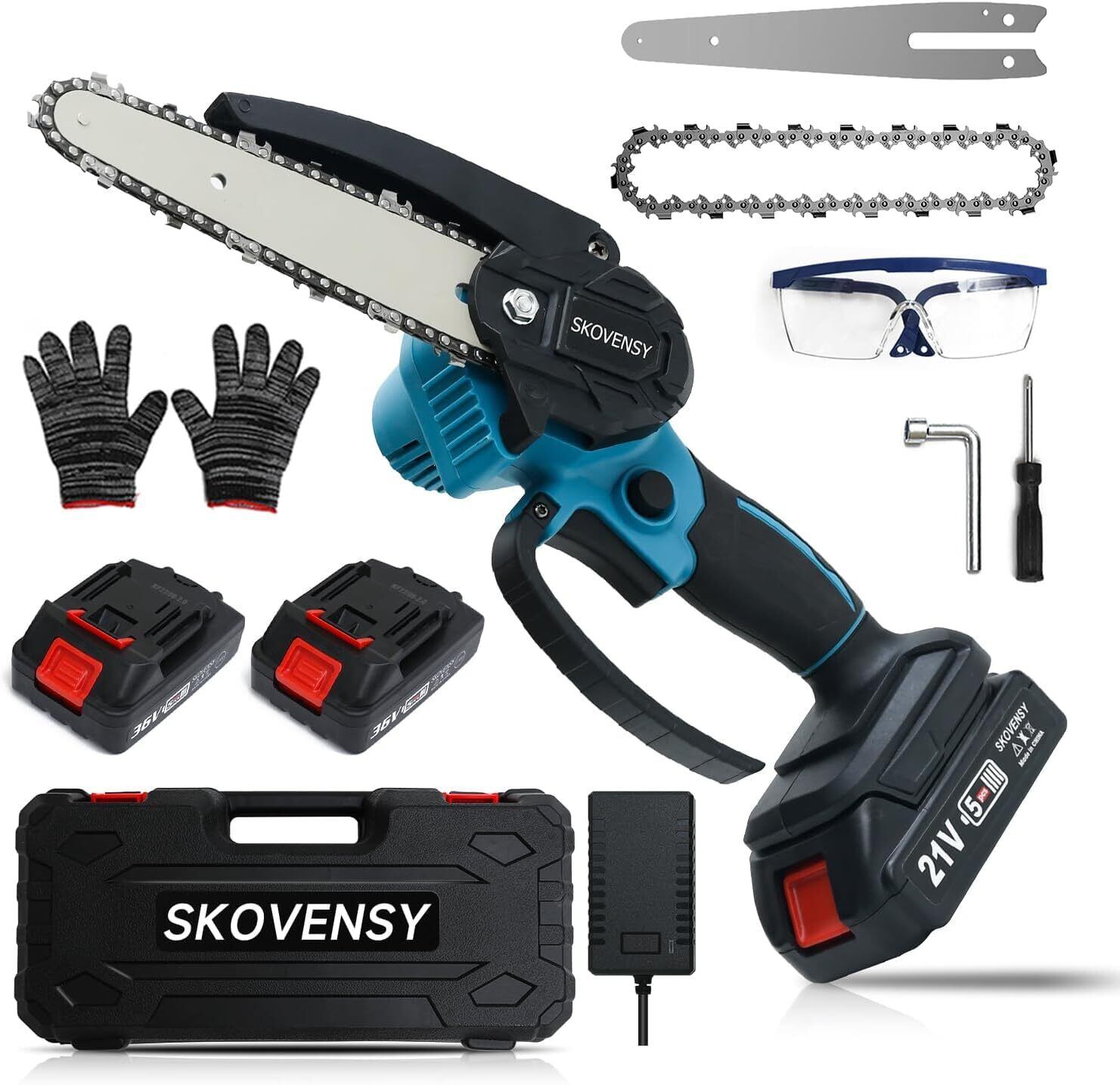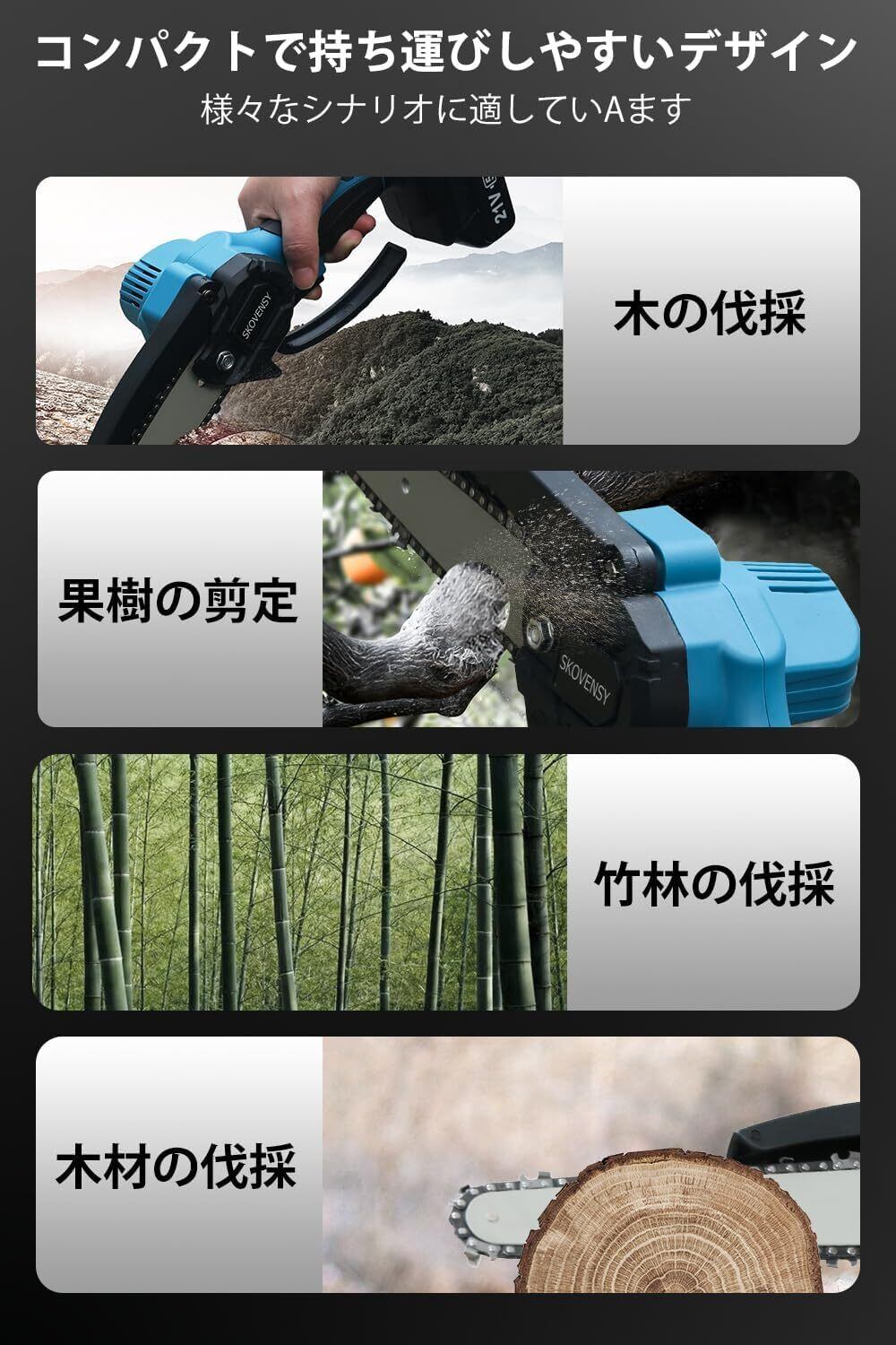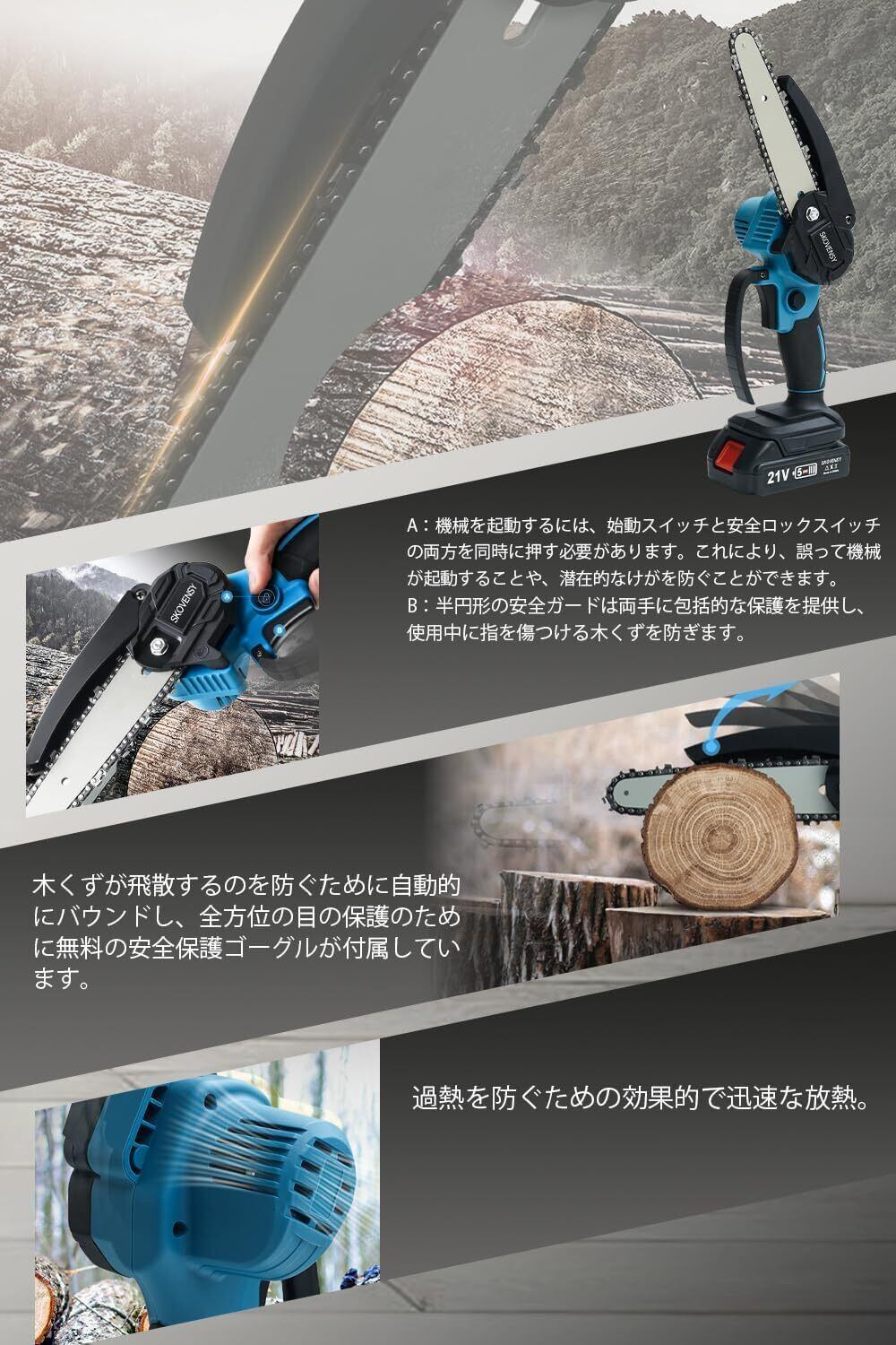 【長時間使用可能な着脱式バッテリー2個】この充電式チェーンソーは、ワイヤレスで使えるため、電源コードに縛られることなく、屋外作業にも最適です。大容量の着脱式バッテリーが2個付属しており、バッテリー切れの際にはすぐにできます。コードレスでの使用が可能なため、作業が効率的で安全に進みます。組み立て不要で、付属のバッテリーを装着するだけで使用可能。収納ケースもついており、収納や持ち運びにも便利です。▲付属品: チェーンソー本体x1、2000mAhバッテリーx2、充電器x1、収納箱x1、ドライバx1、手袋x1、ゴーグルx1、日本語取扱説明書x1、6インチチェーン*1、6インチガイドバー*1、 ご注意:上記のチェ-ンとガイドバー(サイズはランダム)は1点ずつ本体に装着した状態で発送致します。