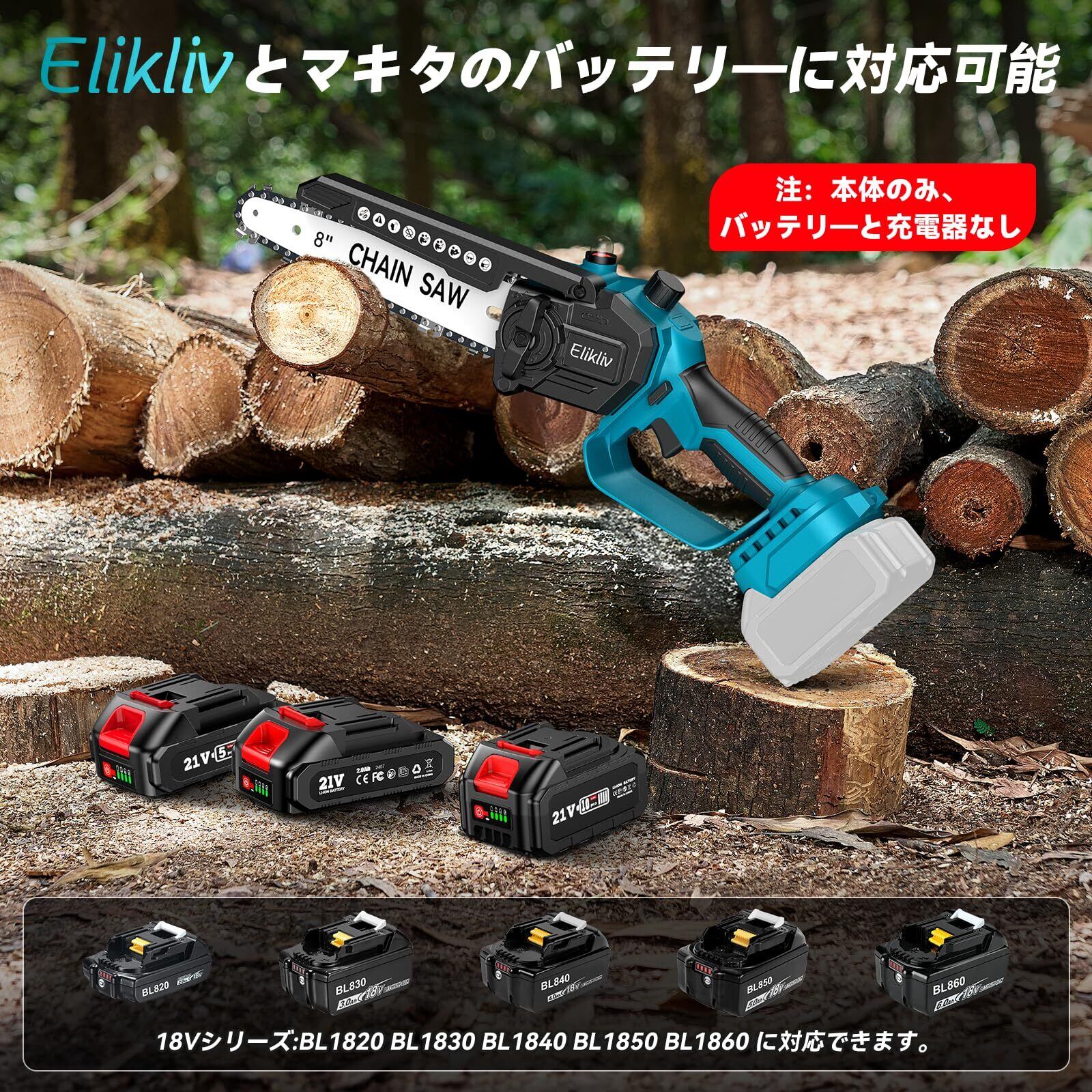 【本体のみ&18Vバッテリー対応】お客様から「すでにバッテリーがある」と伺いました。そこで、電動チェーンソーの本体を販売しています。当社Eliklivのバッテリーはもちろん、BL1820B、BL1830B、BL1840B、BL1850B、BL1860Bといったバッテリーにも対応しています。また、コードレス式であるため、電源コードを接続することなく使用できます。