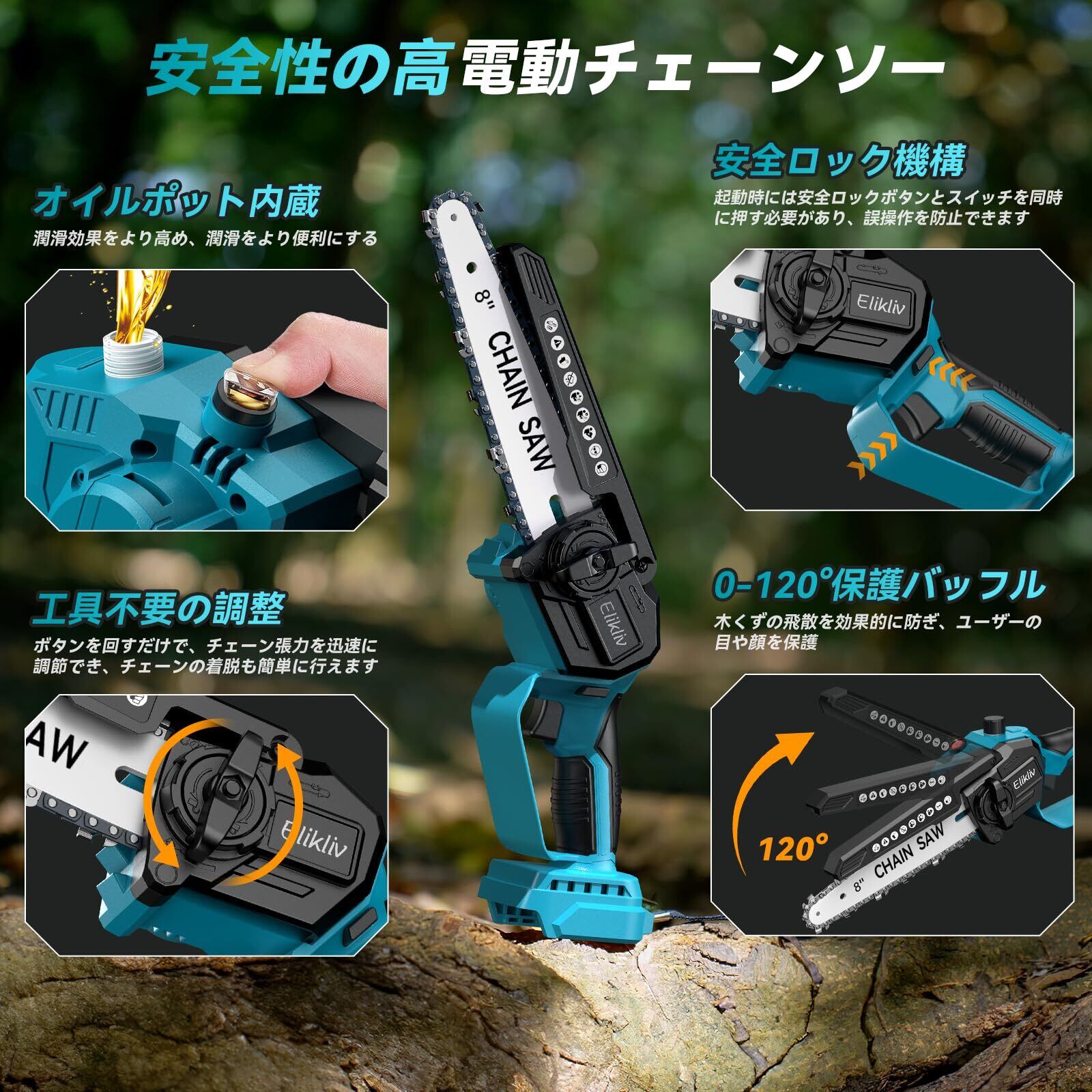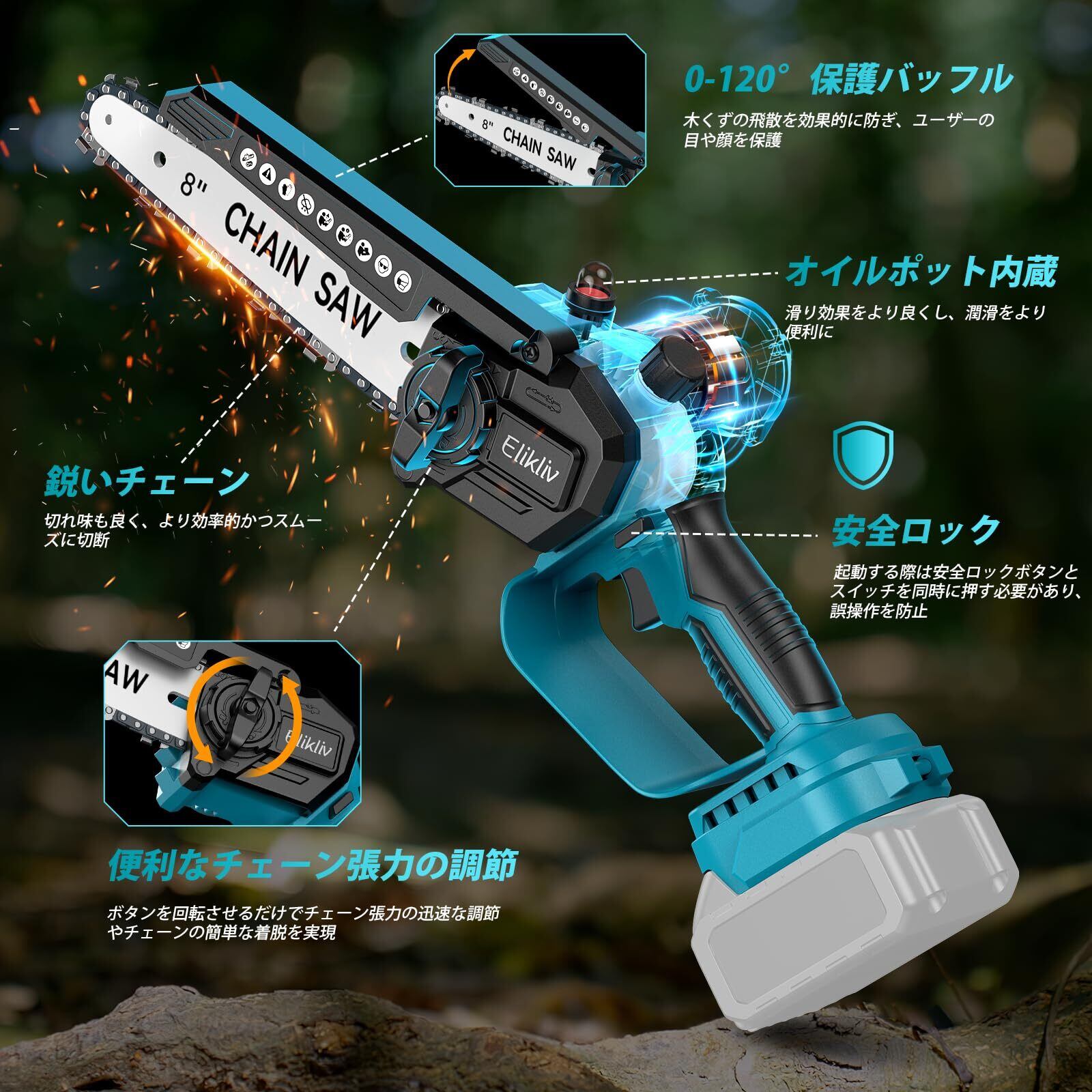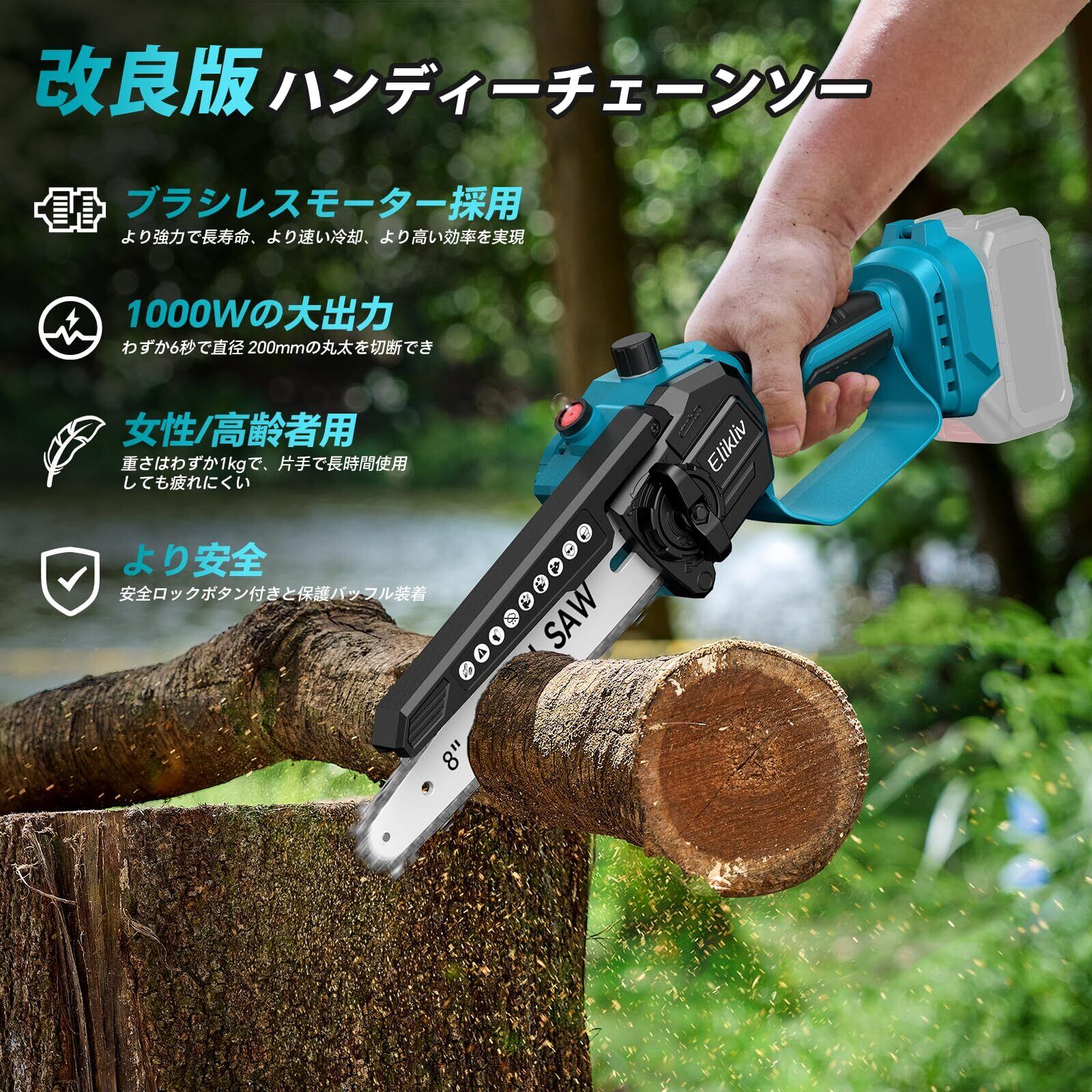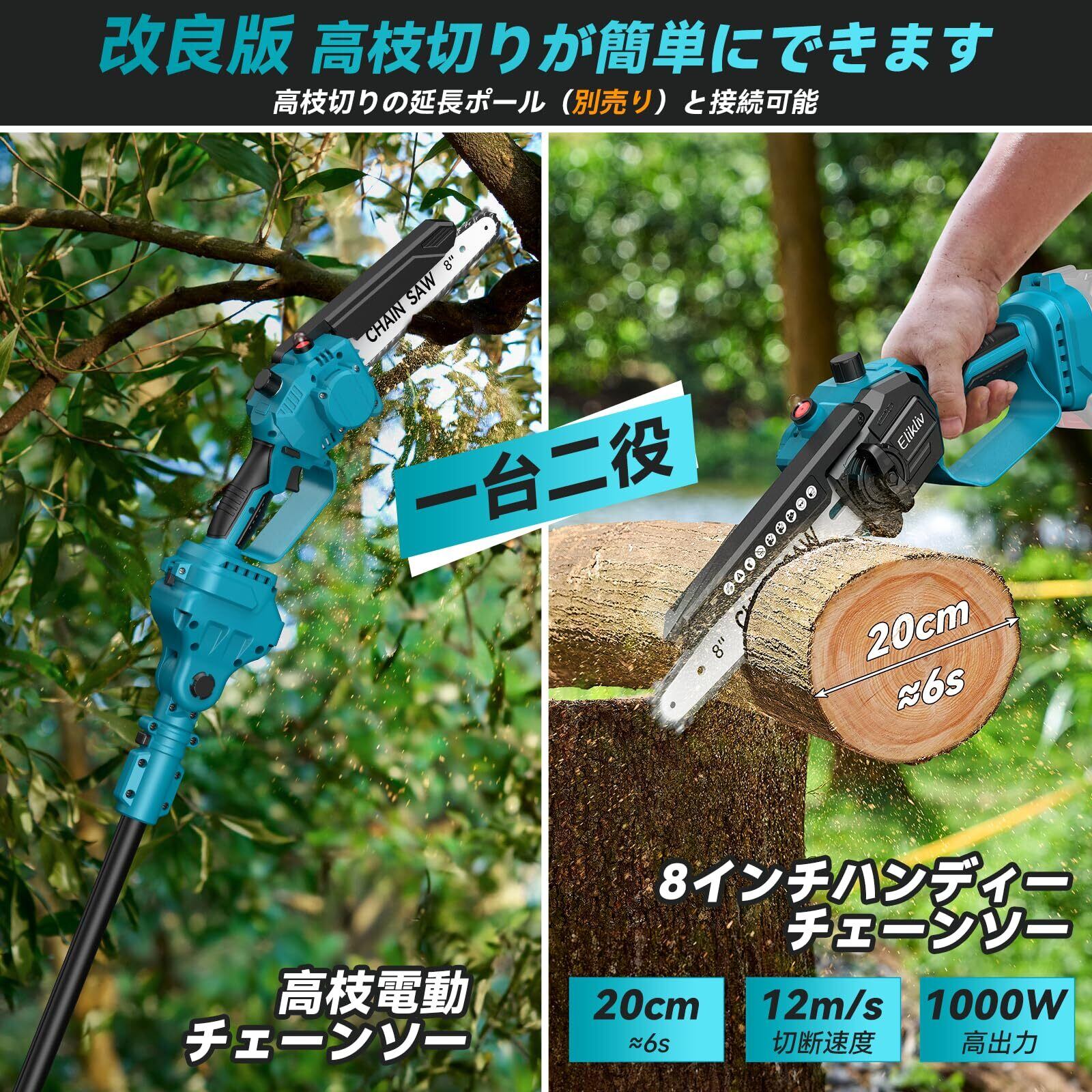 【2025年新登場】Elikliv 電動チェーンソー 8インチ ハンディチェーンソー 高枝切り用延長ポール接続 充電式 ブラシレスモーター採用 18Vバッテリー対応 給油可能 工具不要チェーン調整コードレス 軽量設計 小型 強力切断 片手操作可能 木工 枝切り 薪作り 庭木剪定 竹伐りに最適【本体のみ・バッテリー/充電器別売】 | KSショップ
