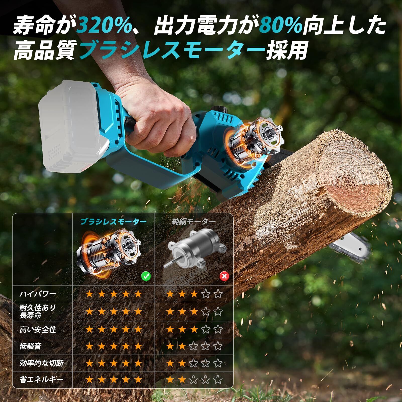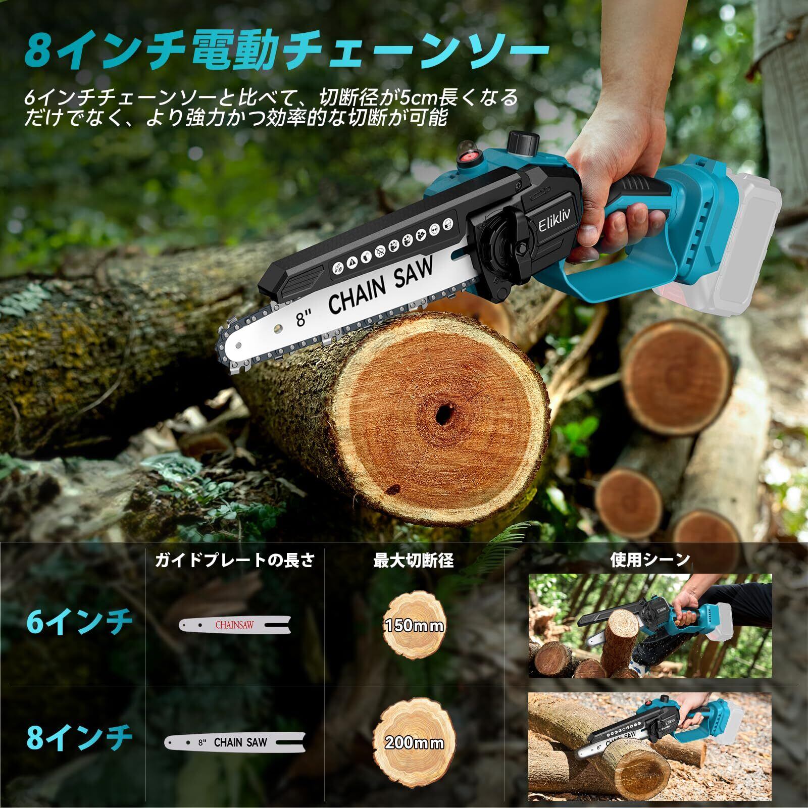 【高切断力の8インチ充電式チェーンソー】強力なブラシレスモーターを搭載し、最大4000rpmで高速回転するEliklivチェーンソーは、わずか6秒で直径200mmの丸太を切断でき、時間とエネルギーを大幅に節約できます。ブラシ付きのモーターを使用した電動チェーンソーと比較すると、寿命が300%増加し、出力電力が80%増加し、エネルギー消費量が50%削減されます。作動時に火花が発生せず、モーターの摩耗が少なく、寿命と効率が大幅に高まります。木材の切断、竹の切断、薪作り、庭木の枝の剪定などの作業に最適です。
