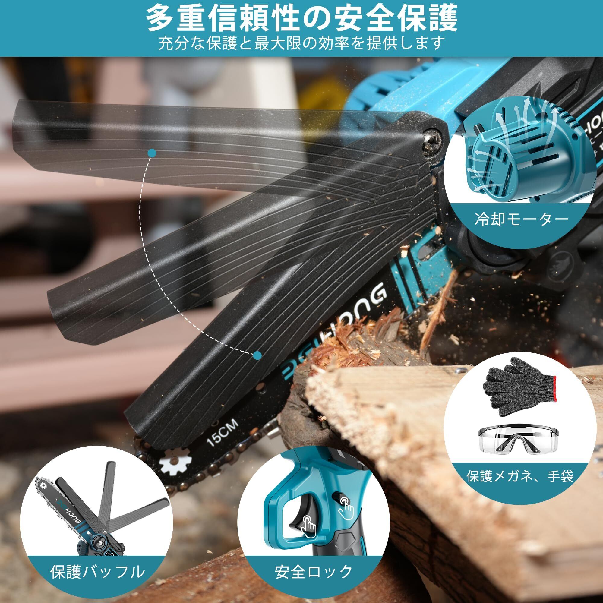 安全性と信頼性:①ダブルロックで誤操作防止のシステムがついており、安全ロックとトリガーを同時に押さなければならない、チェーンソーのトリガーを離すと自動的にロックします。②保護バッフル設計とゴーグルにより、作業中に木くずや屑が目や顔に入らないようにすることができます。手袋も付属しております。③PSE認証を取得しているため、安全性と信頼性をできます。