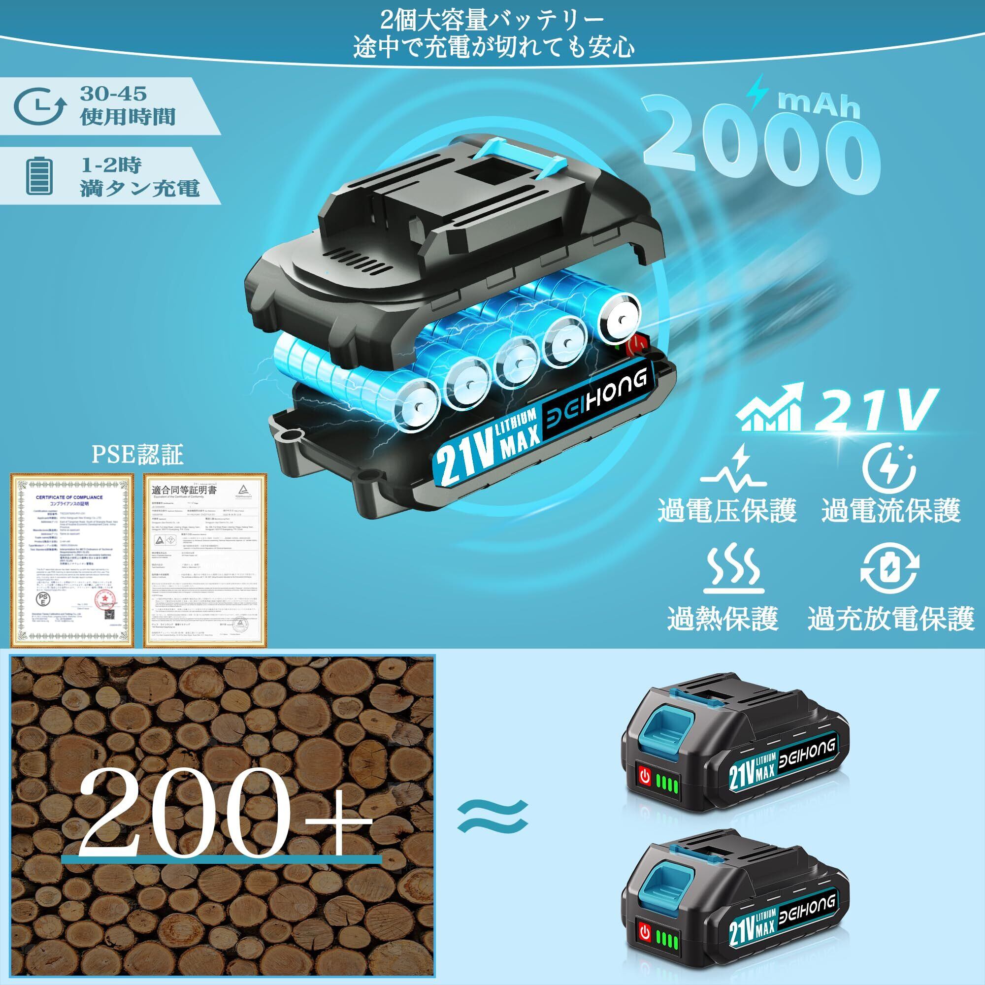 2 PCSバッテリー搭載:2.0mAh大容量バッテリー2つあるので30分の間動くことを保つことができることを確実とします。途中で充電が切れても安心なのがいいですね!フル充電まで1時間と短く。4重安全保護により、電池性能が安定している。バッテリの残量表示や充電状態を明確に示すバッテリLEDもあります。(マキタ 純正電池互換対応、マキタの充電器とは互換性がありません)