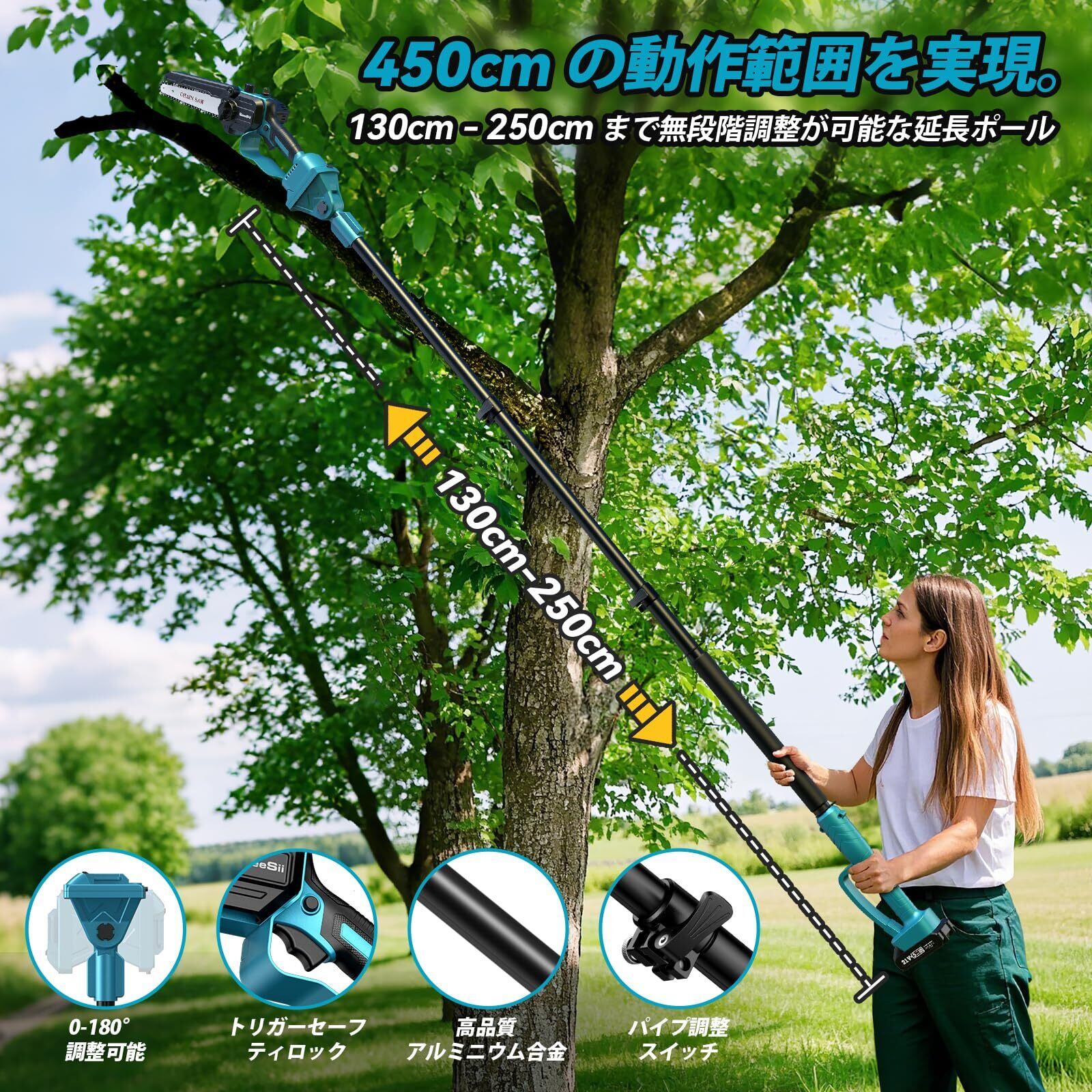 【高枝チェーンソーとハンディチェーンソーの1台2役】ポール付き高枝電動チェーンソーとして高所の枝を楽に剪定できるほか、ポールを取り外せば6インチの手持ちチェーンソーとしても使用可能。低所での木材や枝の切断にも最適です。作業シーンや用途に応じて柔軟に使い分けられます。伸縮ポールは無段階調節式で130cmから最長250cmまで伸ばせ、最大到達範囲は約450cmと広く、高所作業も安全かつ効率的に行えます。さらにヘッド部分は0〜180°の角度調整が可能で、複雑な角度の枝切りもスムーズ。果樹、木材、竹、庭木などの剪定や伐採に最適な一台です。