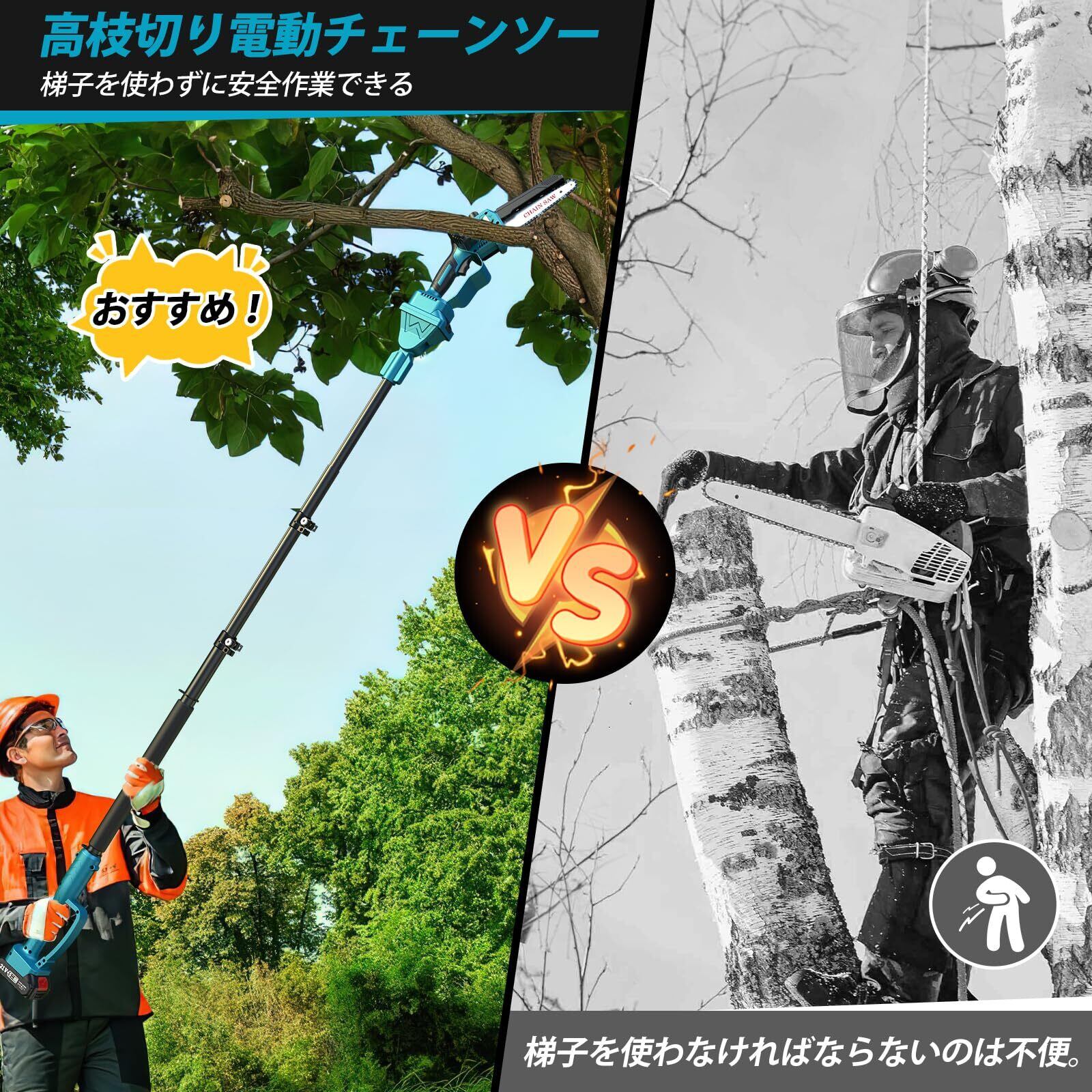 【高枝チェーンソー使用時のご注意】❶必ずチェーンソーの電源を入れてから、切断したい枝に刃を当ててください。❷ご使用前には、バッテリーが十分に充電されていることを確認してください。❸作業時にチェーンソーを強く押し付けないでください。本体および延長ポールの自重だけでスムーズに切断できます。過度な力を加えると、モーターが停止する恐れがあります。