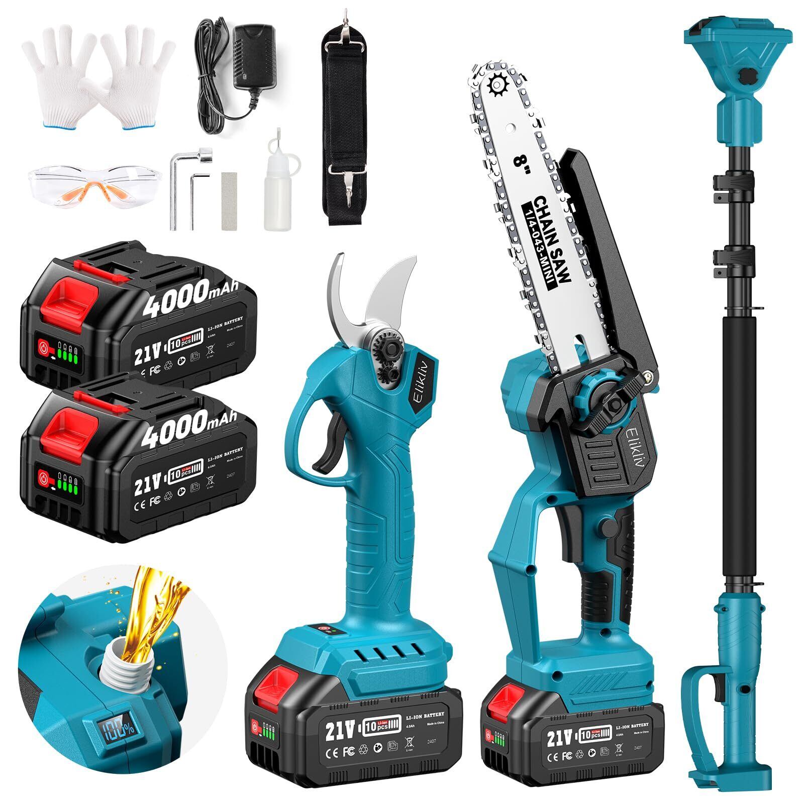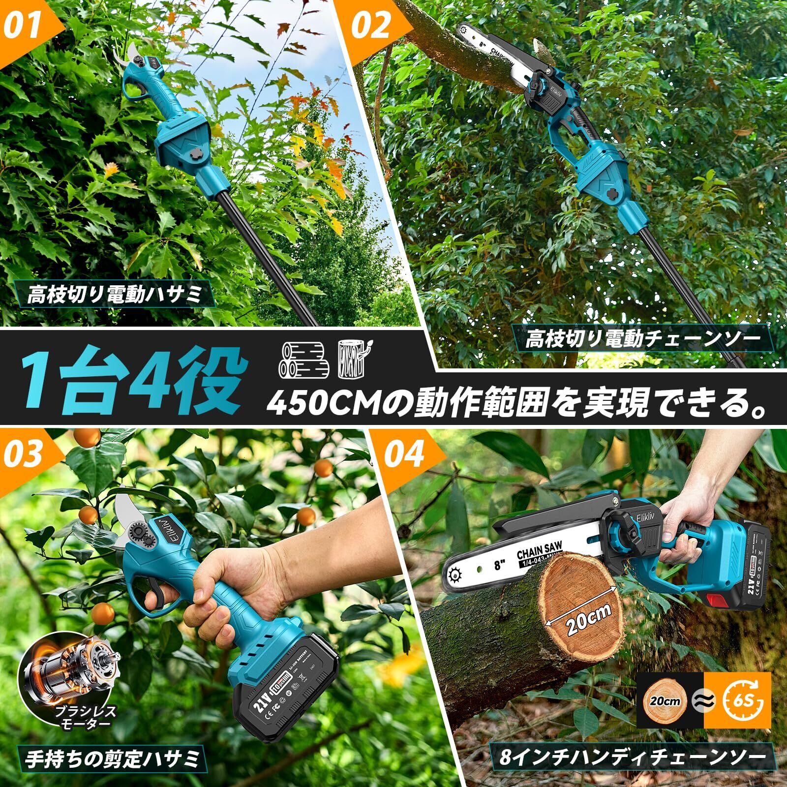 Elikliv 高枝切りチェーンソー 電動 充電式 8インチ コードレス ハンドチェーンソー 伸縮ポール付き(125cm~250cm無段階調節)ブラシレスモーター搭載 オイル差し 残量表示 強力パワー 4.0Ah大容量バッテリー2個付 木工・庭木の剪定・伐採用 E8N | KSショップ