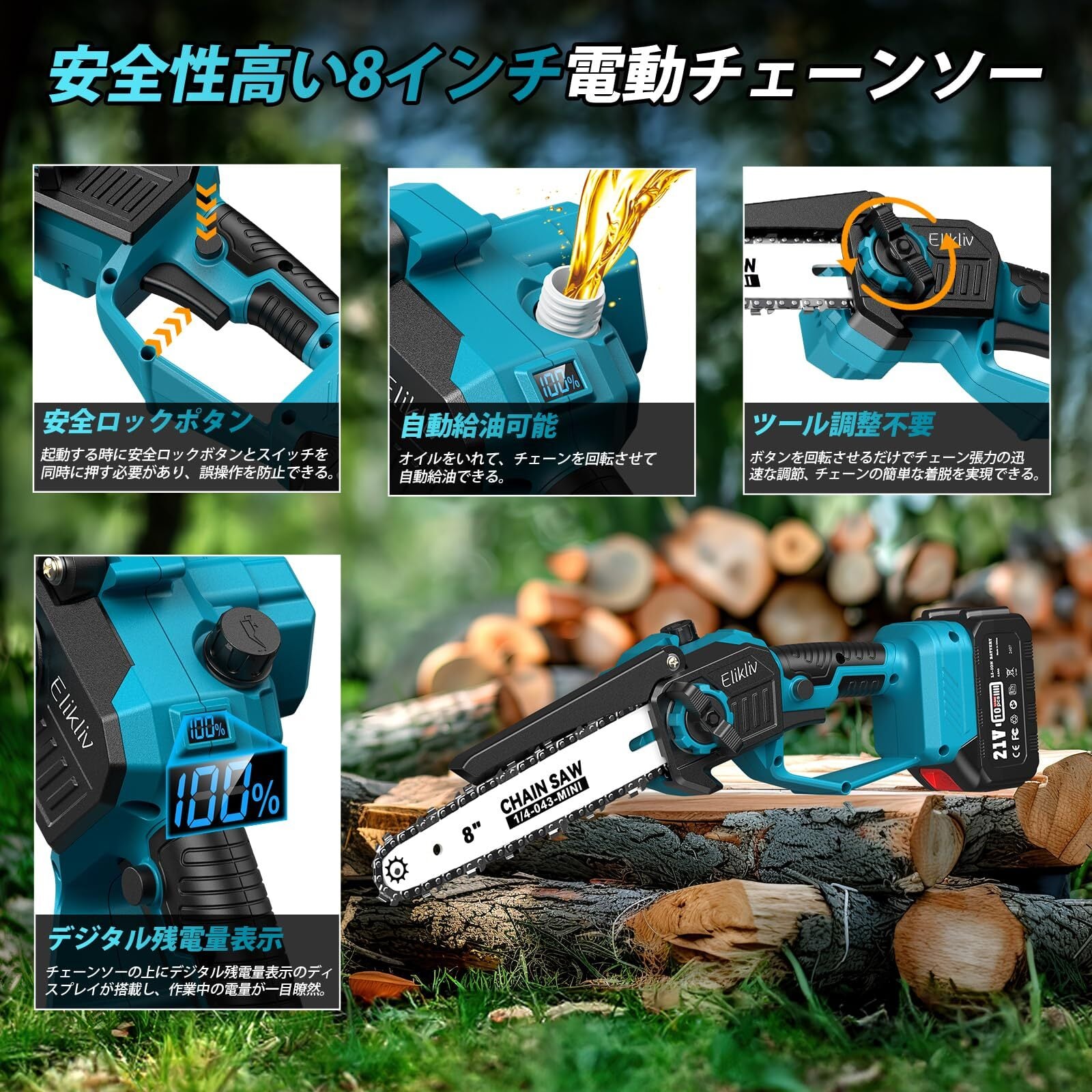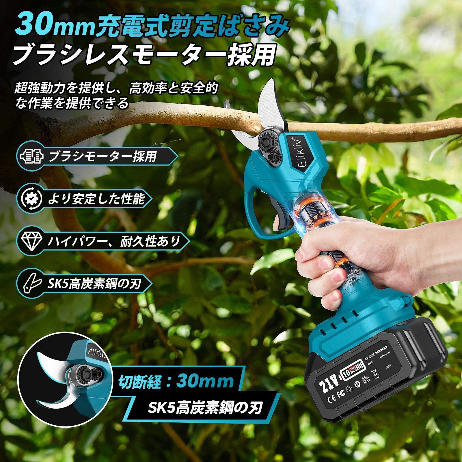 【安心のサポート体制】バッテリーの過放電を防ぐため、少なくとも月に1回は充電をお願いいたします。Elikliv製品はすべて出荷前に厳格な検査を行っておりますが、万が一初期不良や通常のご使用中に故障が発生した場合は、ご遠慮なく販売店までご連絡ください。お客様のご満足を最優先に、迅速かつ丁寧に対応いたします。▲▲▲【お問い合わせ方法】「アカウントサービス」→「注文履歴」→「注文番号」→「販売者」→「質問する」からご連絡いただけます。️【高枝チェーンソーご使用上の注意】❶ 機械を起動してから切断部分にセットしてください。❷ ご使用前にバッテリーを必ず満充電してください。❸ ご使用時は強く押し付けず、チェーンソーおよび高枝ポールの自重のみでご使用ください。過度な力を加えると停止する原因となります。