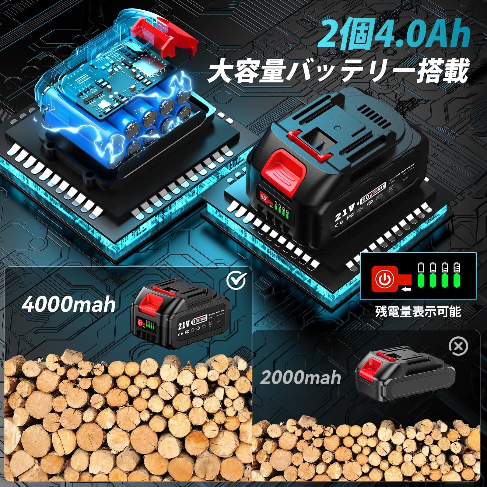 【大容量4.0Ahバッテリー2個&残量表示付き】高枝切り電動チェーンソーには、残量表示機能付きの大容量4.0Ahバッテリーが2個付属しています。バッテリーを交互に使用することで、頻繁な充電作業の手間を大幅に削減。屋外での作業でも長時間パワフルに使用でき、高い作業効率を維持します。さらに、軽量設計により片手でも操作しやすく、高所での剪定や様々な現場作業を快適に行えます。ご注意:1. 付属の充電器は本品付属のバッテリー専用です。他の製品へのご使用はお控えください。2. バッテリーの過放電を防ぐため、月に1回以上充電してください。3. 追加バッテリーはASIN:B0CNSM4WQBよりご購入いただけます。