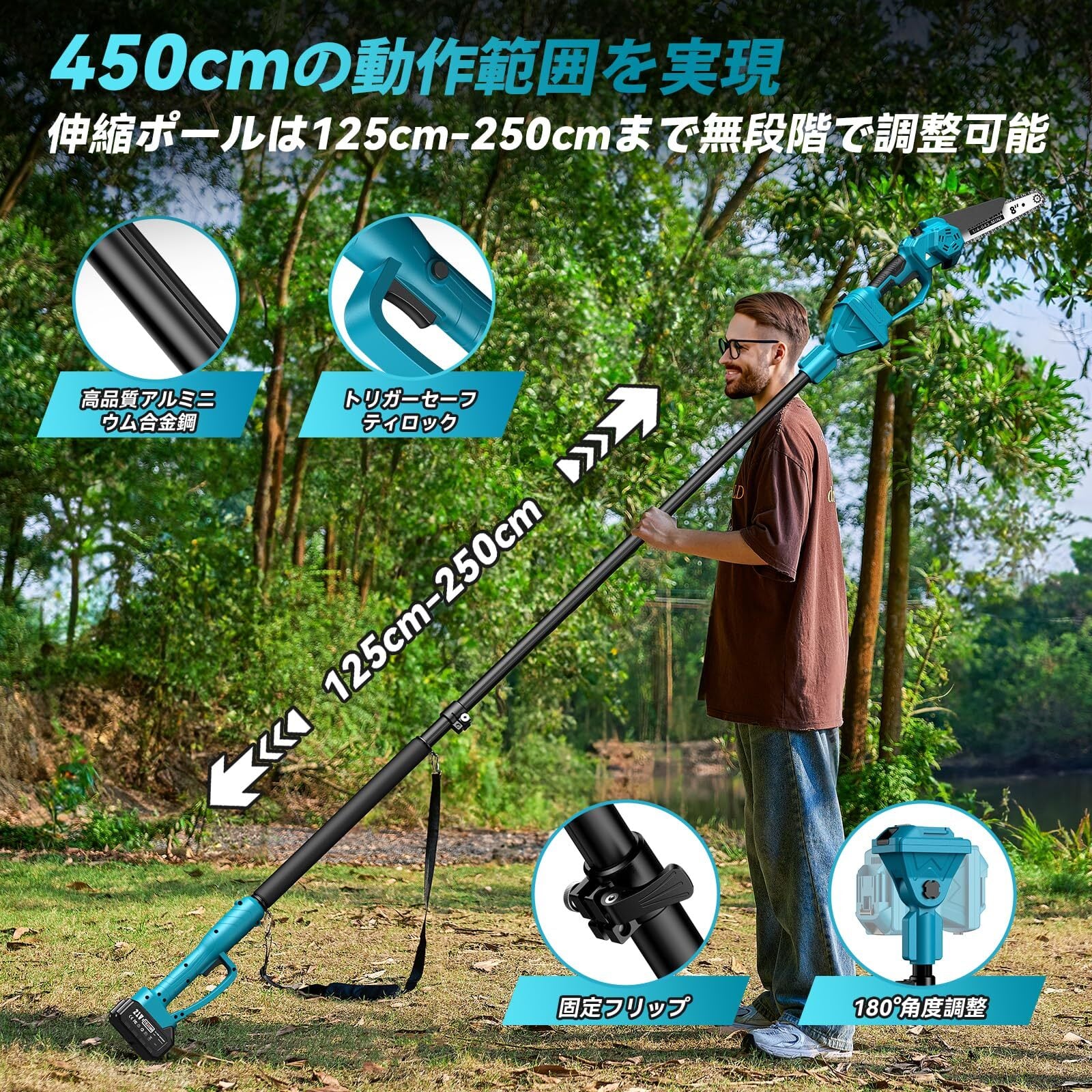 【1台4役の高枝切りチェーンソーセット】 E8Nは、手持ち8インチ充電式チェーンソーと高枝用8インチ電動チェーンソーの2つのモードを簡単に切り替えることができます。付属の伸縮ポールは無段階で125cmから250cmまで調節可能で、最大約4.5mの作業範囲に対応し、高い場所の作業も安全かつ効率的に行えます。また、ヘッド部分は0〜180°の角度で自在に調整できるため、切断作業がよりスムーズに。作業場所や用途に合わせて柔軟にご使用いただけます。