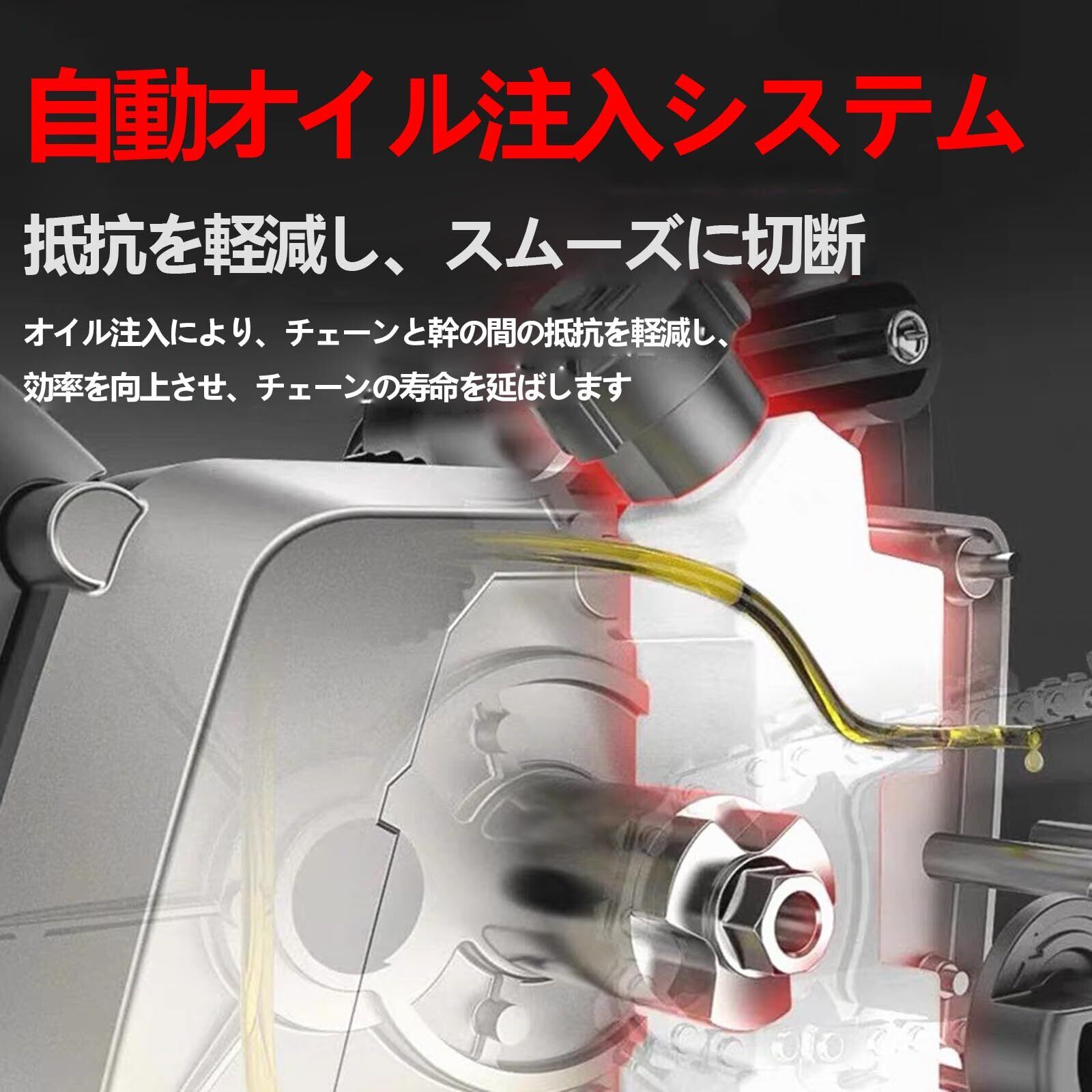 【潤滑システムについて】使用前後に少量(5ml)の潤滑油を注入し、チェーンソーを始動して潤滑を行ってください。使用中にオイルタンクに注油しないでください。