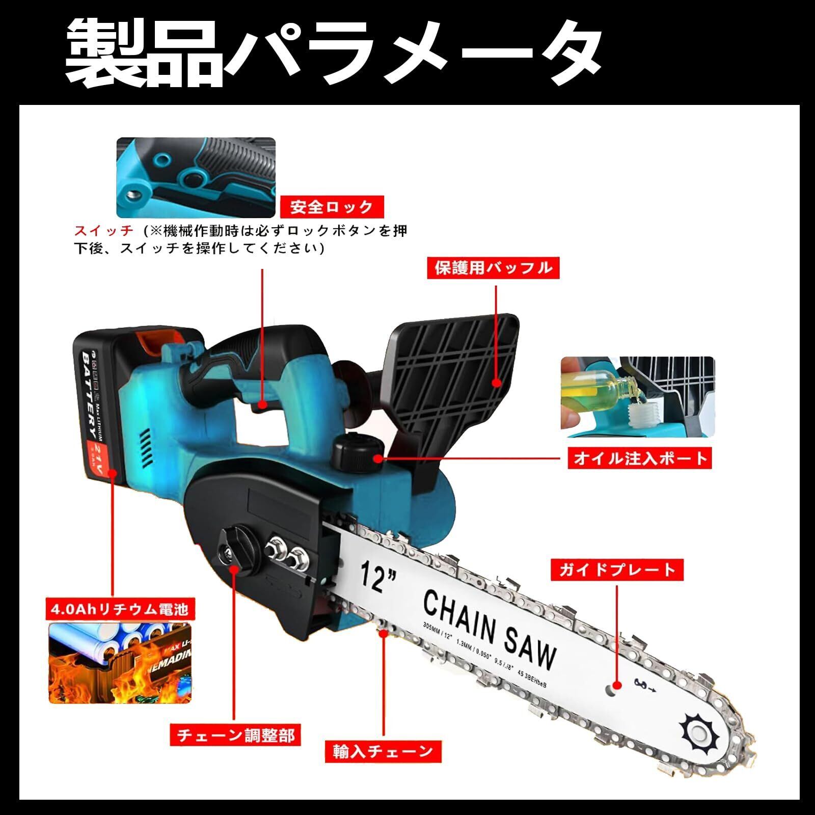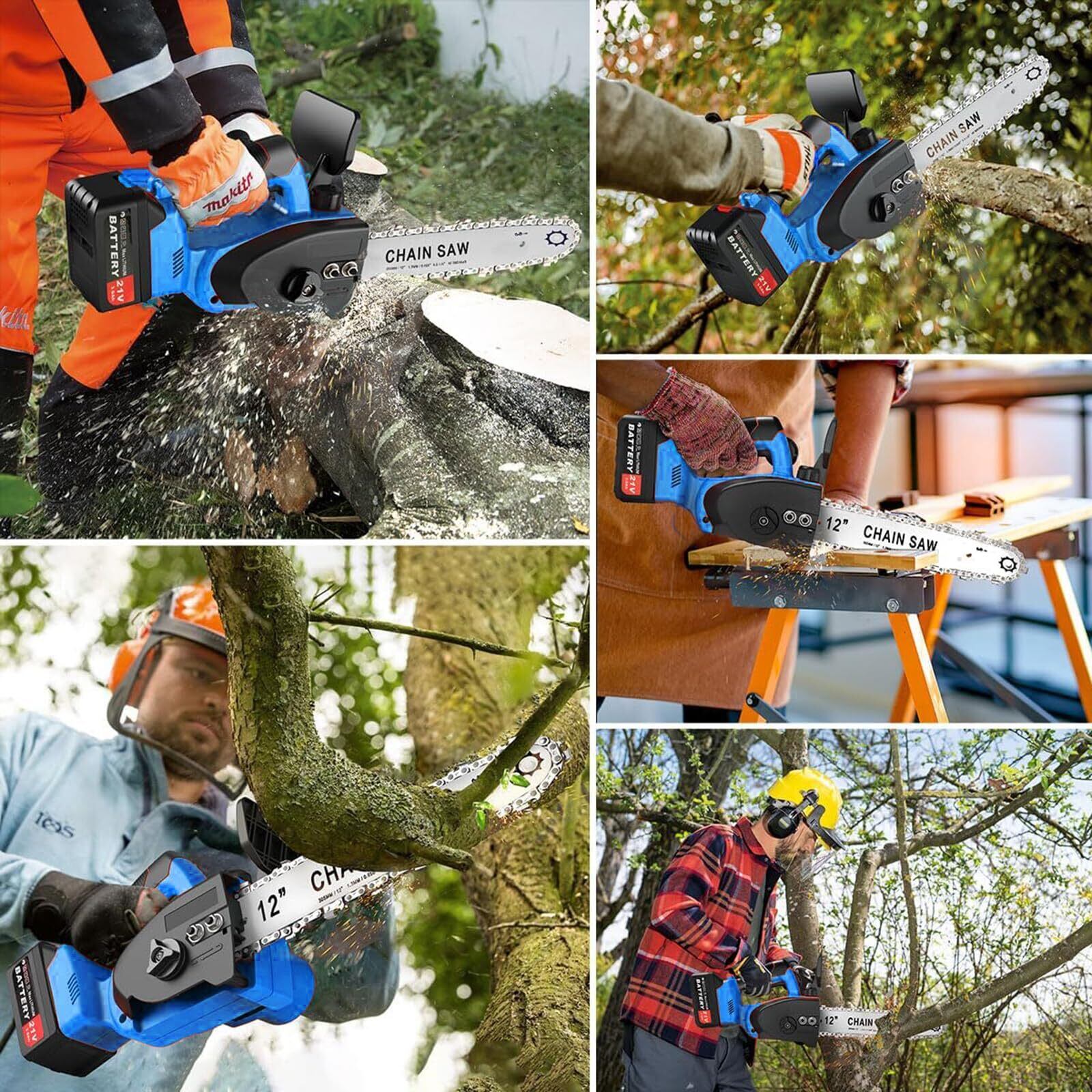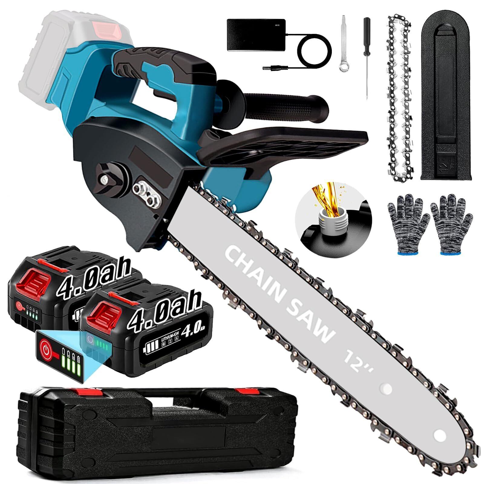 【12インチコードレスチェーンソー】重量はわずか3kg、切断径は350mm、2つの大容量4000mAhバッテリー(18Vバッテリー互換)を装備し、電源に接続する必要がないため、屋外作業に最適です。家庭のDIYから樹木の伐採まで幅広く対応します。専用の収納ケース付きで、軽量かつ持ち運びが容易です。