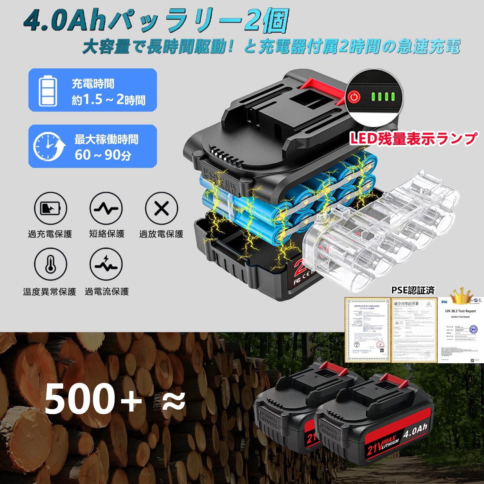 【4.0Ahリチウムイオンバッテリー&18Vバッテリー互換性】2つの大容量4000mAhバッテリーを装備しており、作業中にバッテリーが切れる心配はありません。急速充電技術により充電時間が短縮され、作業効率が向上します。(BL1830b BL1840b BL1850b BL1860b)【環境に優しい設計】ゼロ排出:排気ガスを排出せず、環境保護基準を満たしており、持続可能な発展を重視する消費者に適しています。