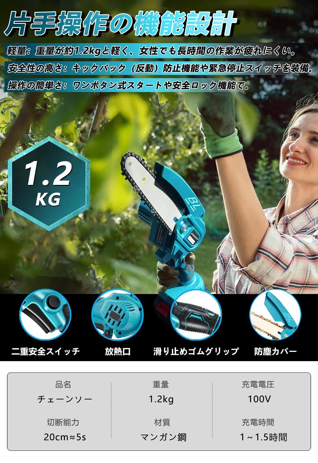 【軽量設計】チェーンソーは1.2キログラム、延長ポールは0.7キログラムで、補助ショルダーストラップを使用することで腕への負担が50%軽減され、女性や高齢者でも簡単に使用できます。