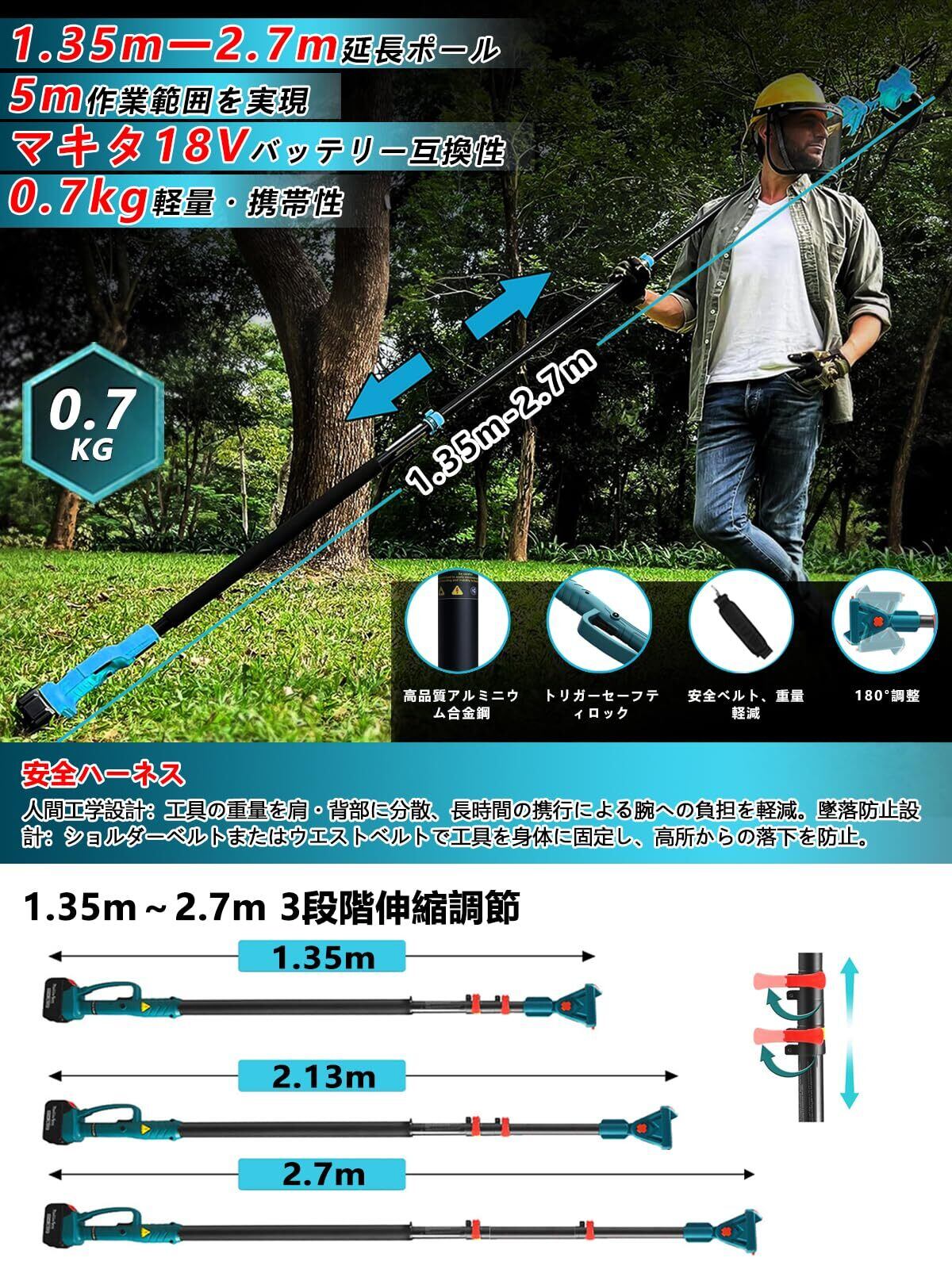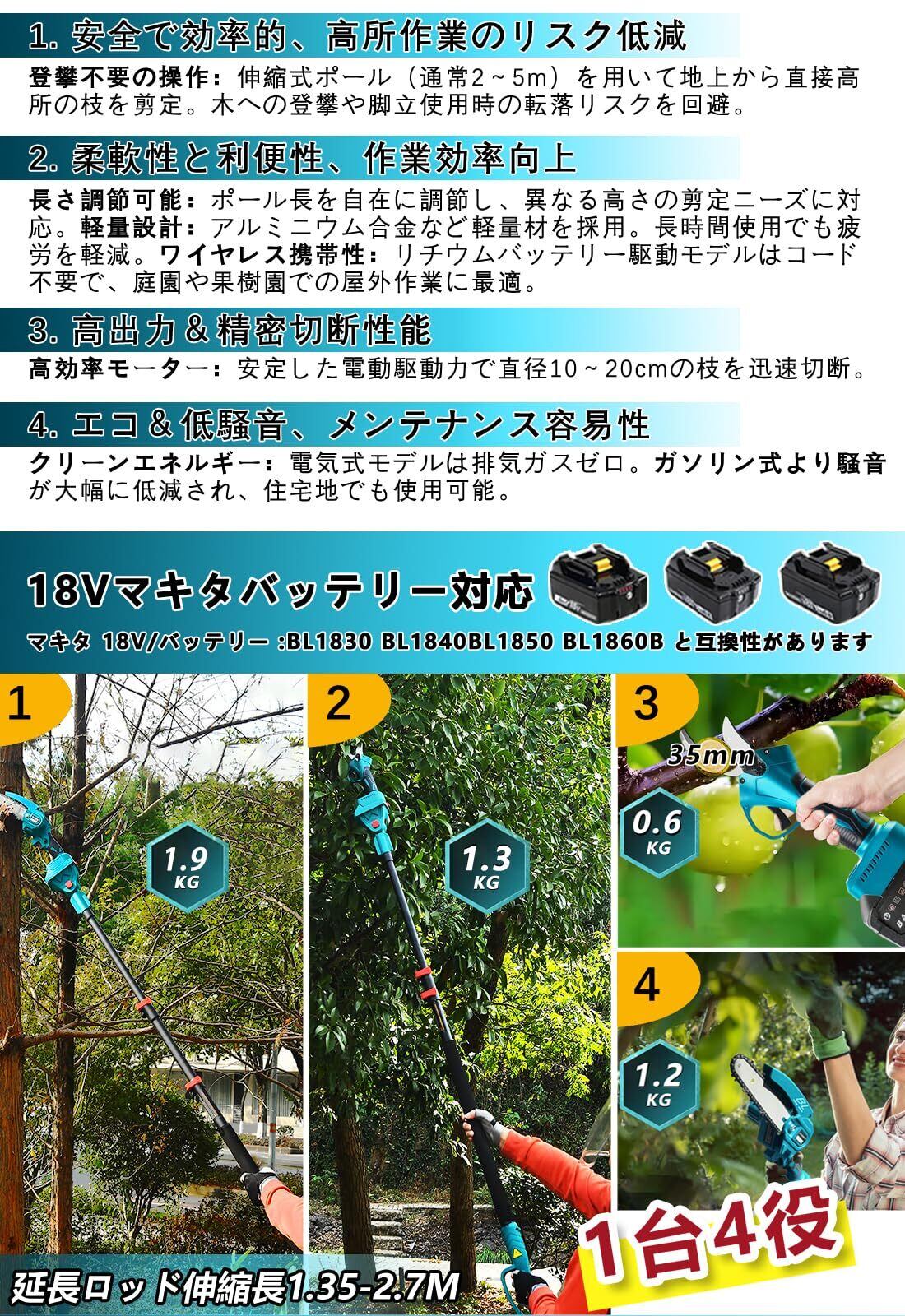 高枝チェーンソー 高枝電動バサミ 18v互換 伸縮2.7M ブラシレスモーター 4.0Ah総容量 軽量 コードレス たかえだ 電動 チェーンソー 電動剪定バサミ 1台4役セット・プロ伐採・園芸・木工切断・庭木の剪定|日本語説明書付(青)