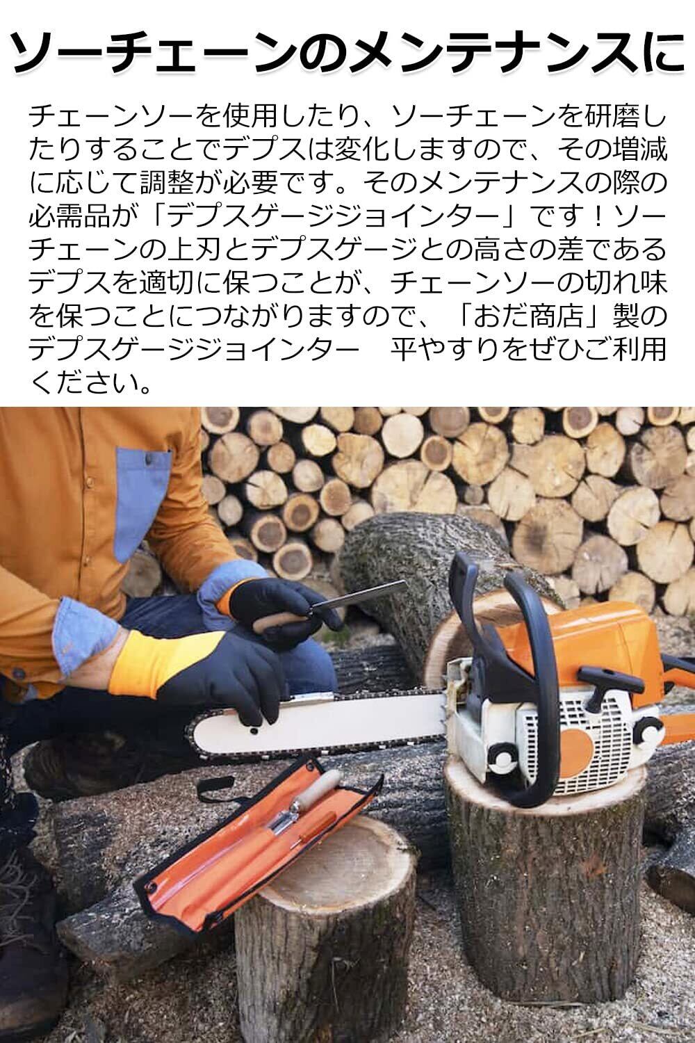 【 ソーチェーンメンテナンスの必需品! 】 チェーンソーを使用したり、ソーチェーンを研磨したりすることでデプスは変化しますので、その増減に応じて調整が必要です。そのメンテナンスの際の必需品が「デプスゲージジョインター」です!ソーチェーンの上刃とデプスゲージとの高さの差であるデプスを適切に保つことが、チェーンソーの切れ味を保つことにつながりますので、「おだ商店」製のデプスゲージジョインター 平やすりをぜひご利用ください。