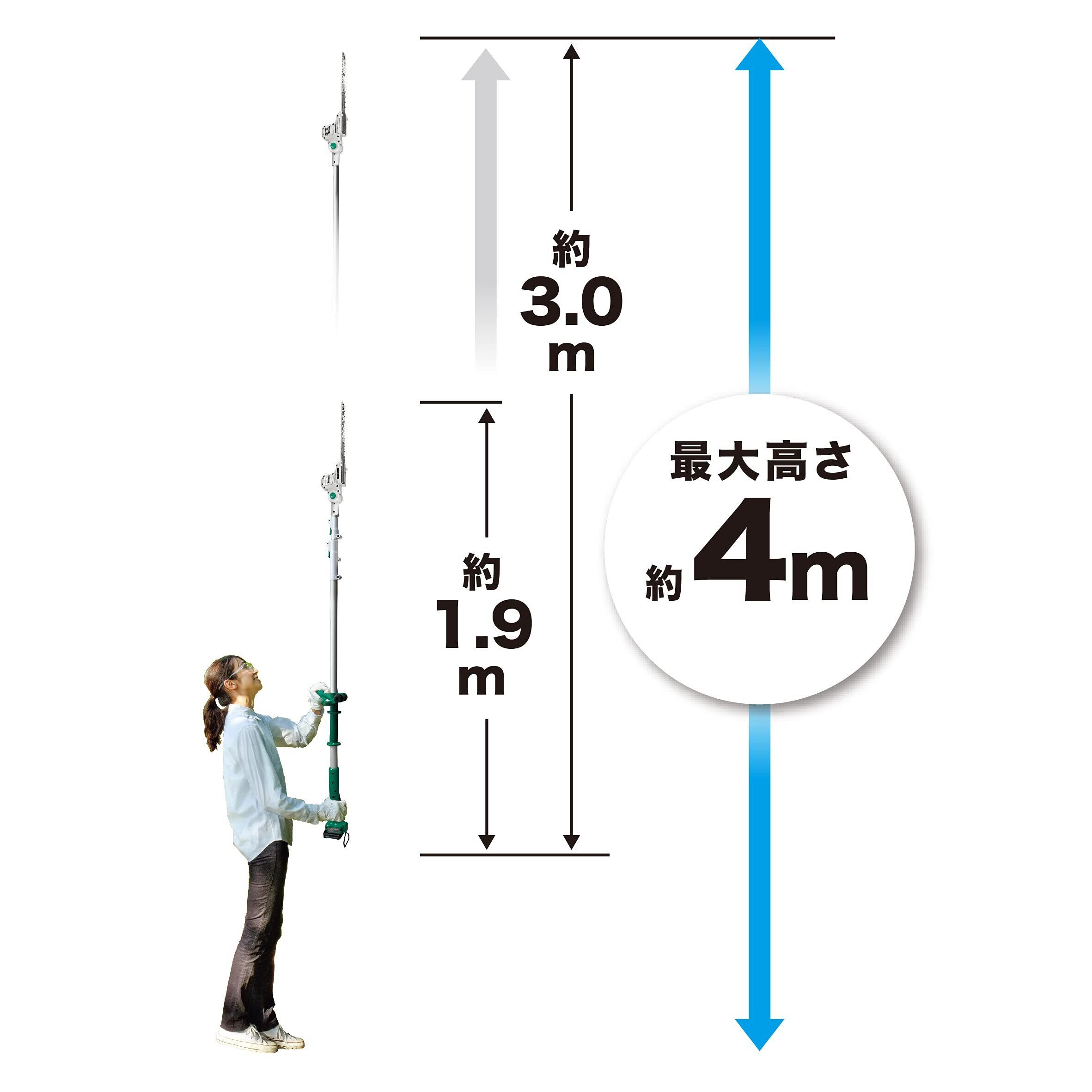 最大高さ約4mまで届く(本体約3m)、家周りの高木や生垣を楽らくせん定 。