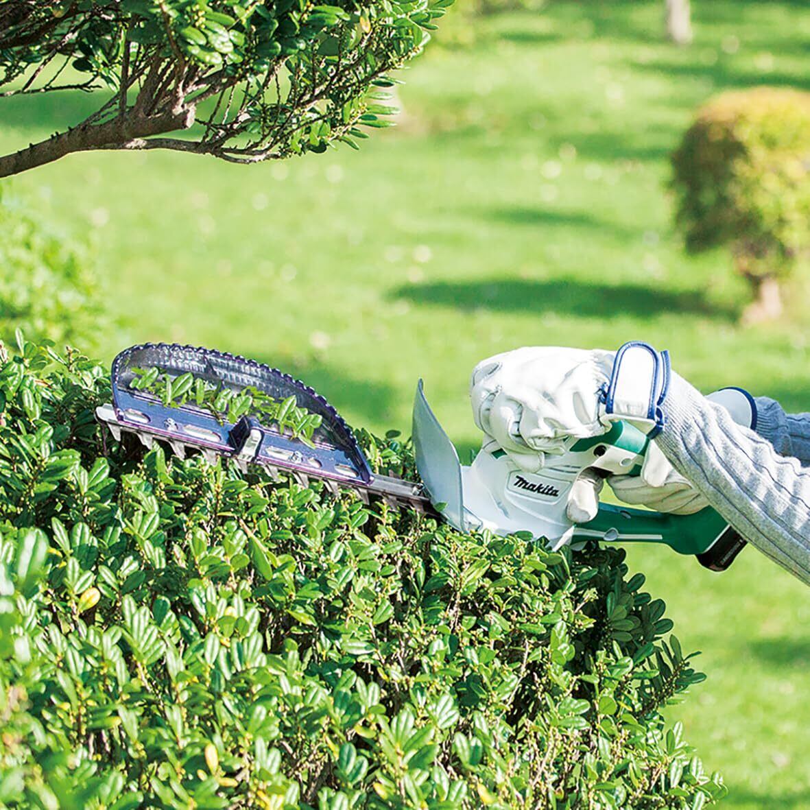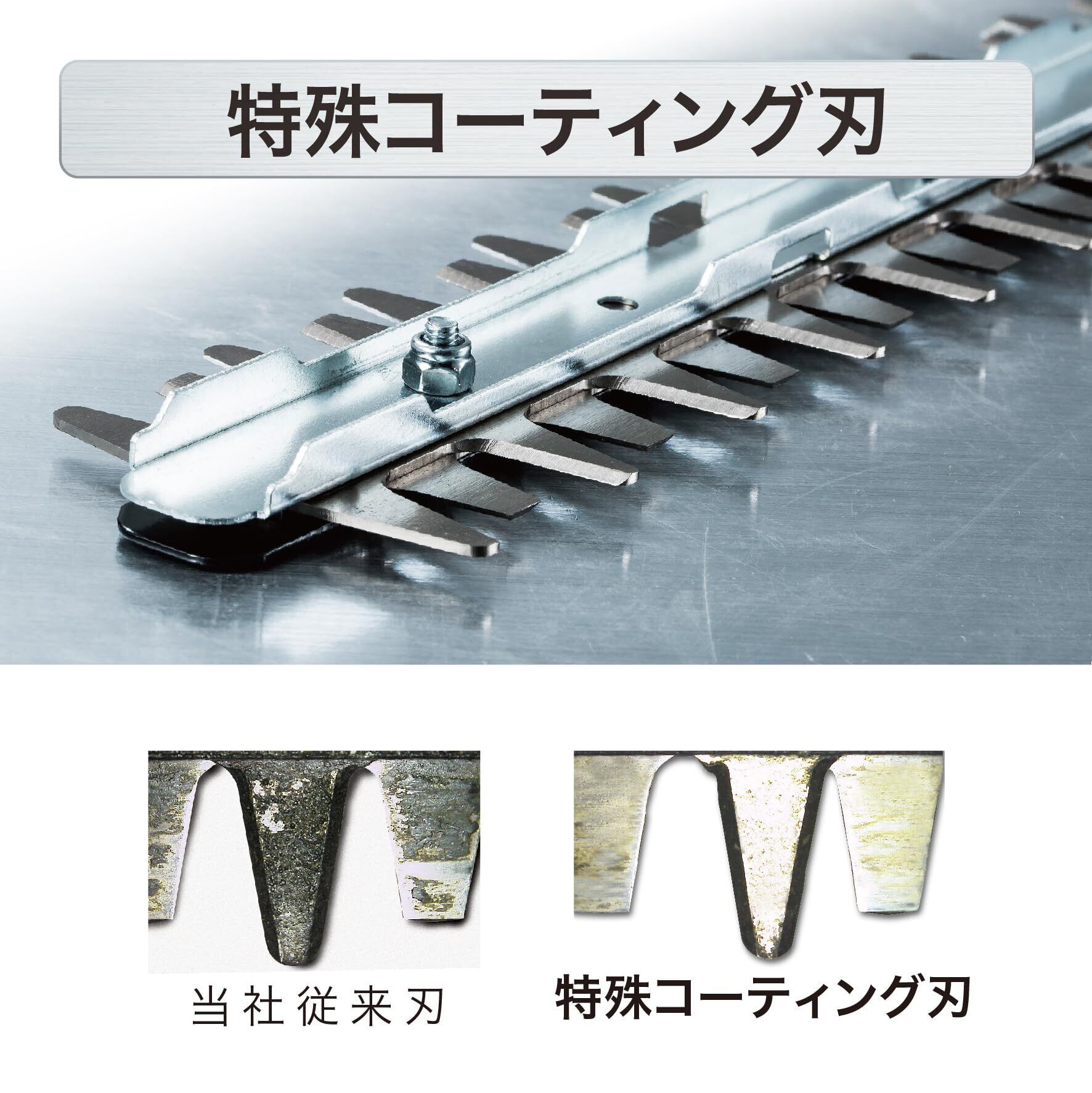 特殊コーティング刃仕様、従来の刃物よりヤニがつきにくく、サビにくい。無電解ニッケルメッキ採用。芝生バリカンとしても使える2Wayタイプの生垣バリカン(要別販売品)。