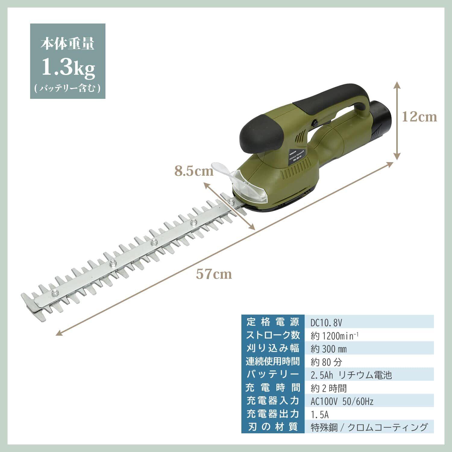 【商品仕様】本体サイズ:幅8.5×奥行57×高さ12cm/重量:1.3kg/定格電圧:DC10.8V/ストローク幅:約1,200min-1/刈込幅:約300mm/刃の材質:特殊鋼・クロムコーティング/充電器入力:AC100V(50Hz/60Hz)/充電器出力:1.5A/充電時間:約2時間/連続使用時間:約80分/バッテリー:2.5Ah リチウム電池/付属品:充電池、専用充電器、充電器電源アダプター、ヘッジトリマー刃、ブレードカバー、ハンドガード、ドライバー、取扱説明書