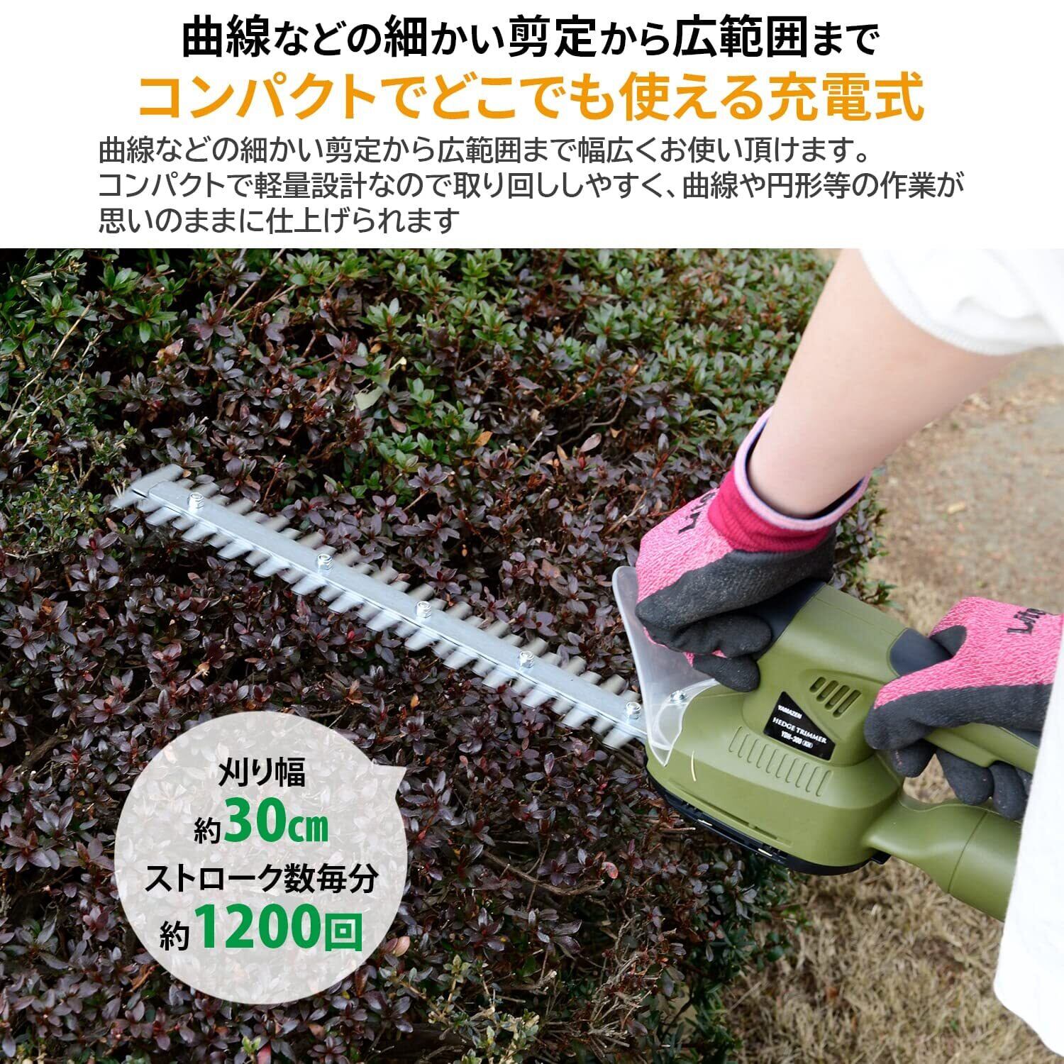 ●庭木の剪定や生垣の刈込にオススメ、コンパクトでどこでも使える充電式コードレストリマーです。