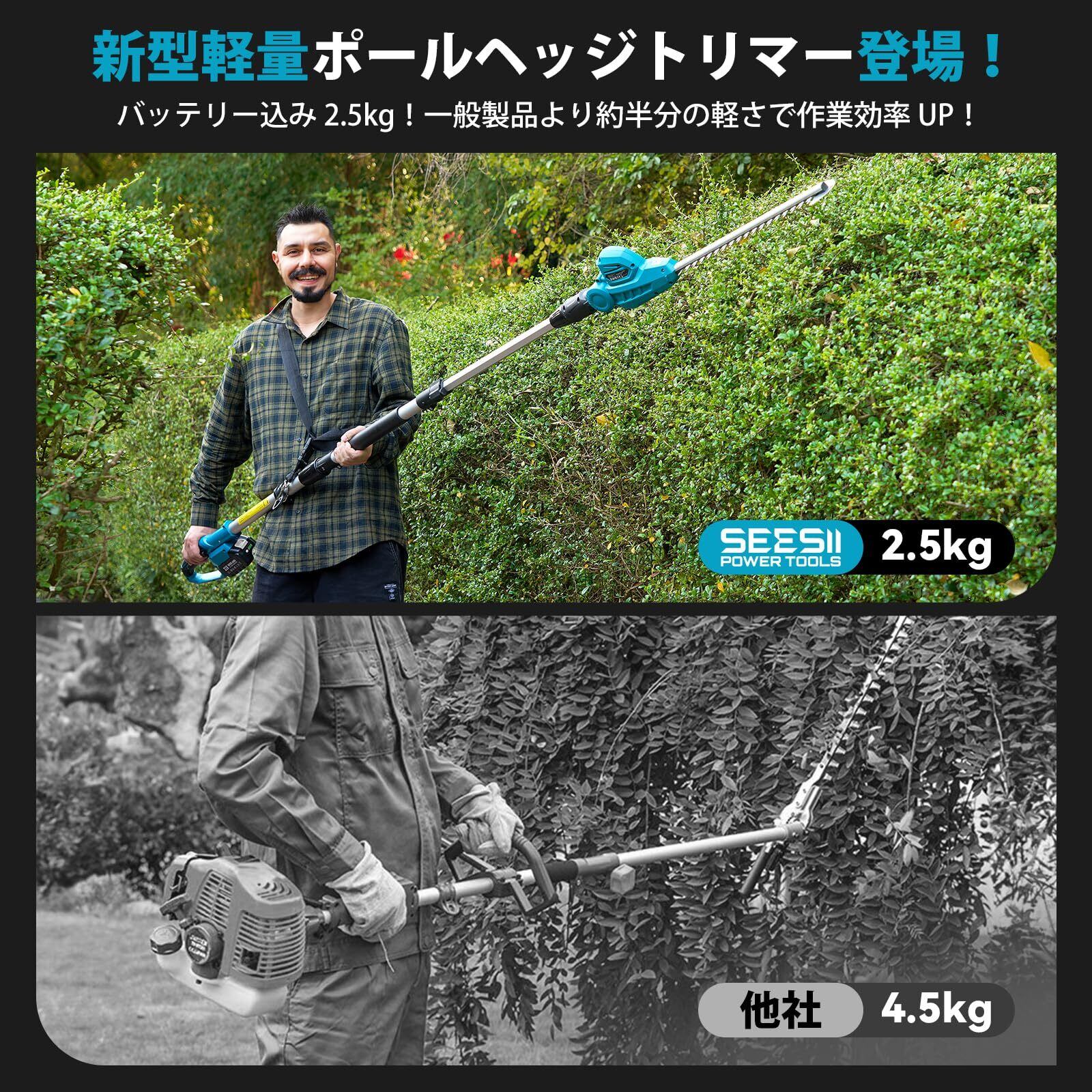 ️【新型軽量ポールヘッジトリマー登場!】SEESIIのポールヘッジトリマーは、バッテリー込みでわずか2.5kgとなっております。これは一般製品の半分以下の重量ですので、長時間の作業でも肩や腕への負担が大幅に軽減されます。高所や奥行きのある生け垣の剪定も楽々と行え、手の震えや疲れを抑えながら正確なカットが可能です。軽量化により作業効率が向上しますので、園芸愛好家の皆様におすすめの新パートナーとさせていただきます。