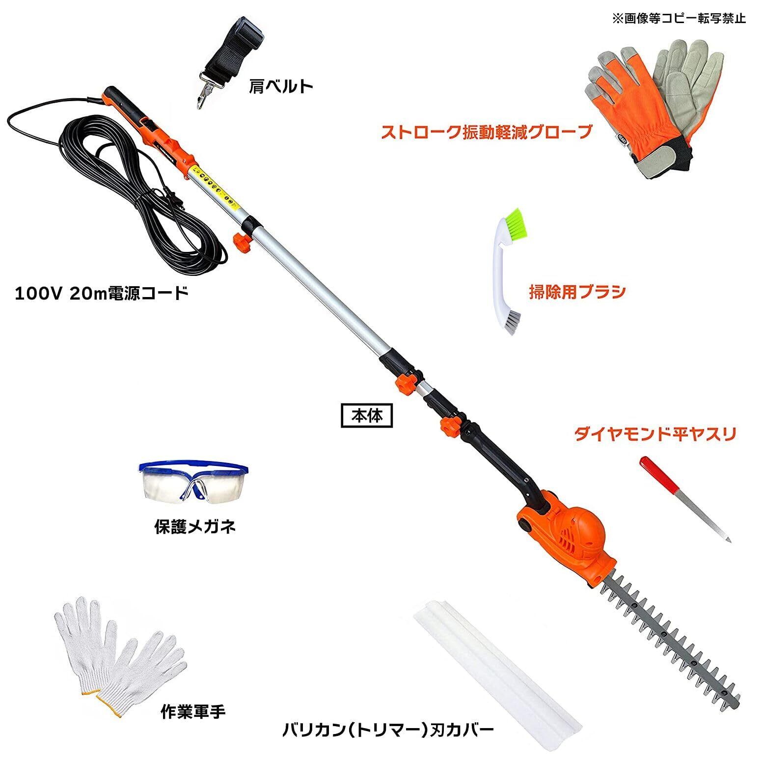 最短作業長本体1.8m目線に近い高さから全最長3m(身長合わせれば3m以上)の高さまで、高枝ロングポール電動バリカン(ロングポールヘッジトリマー)なのに、女性でも作業ラクラクな2.3kgと超軽量な本体ポールで高いところも簡易的に植木お手入れが出来きる3mバリカン(100V電源コード付)と、PROSTARがサービス特典付属するストローク振動軽減グローブ・ダイヤモンド平ヤスリ・掃除用ブラシ付の便利なPROSTAR特典付属付パックです。【※こちらの本体商品は100Vコンセント電源コード仕様(コードレスではありません) ※こちらの本体商品はバリカン(ヘッジトリマー)刃であり、チェーンソーやノコギリ(レシプロソー)ではありません】