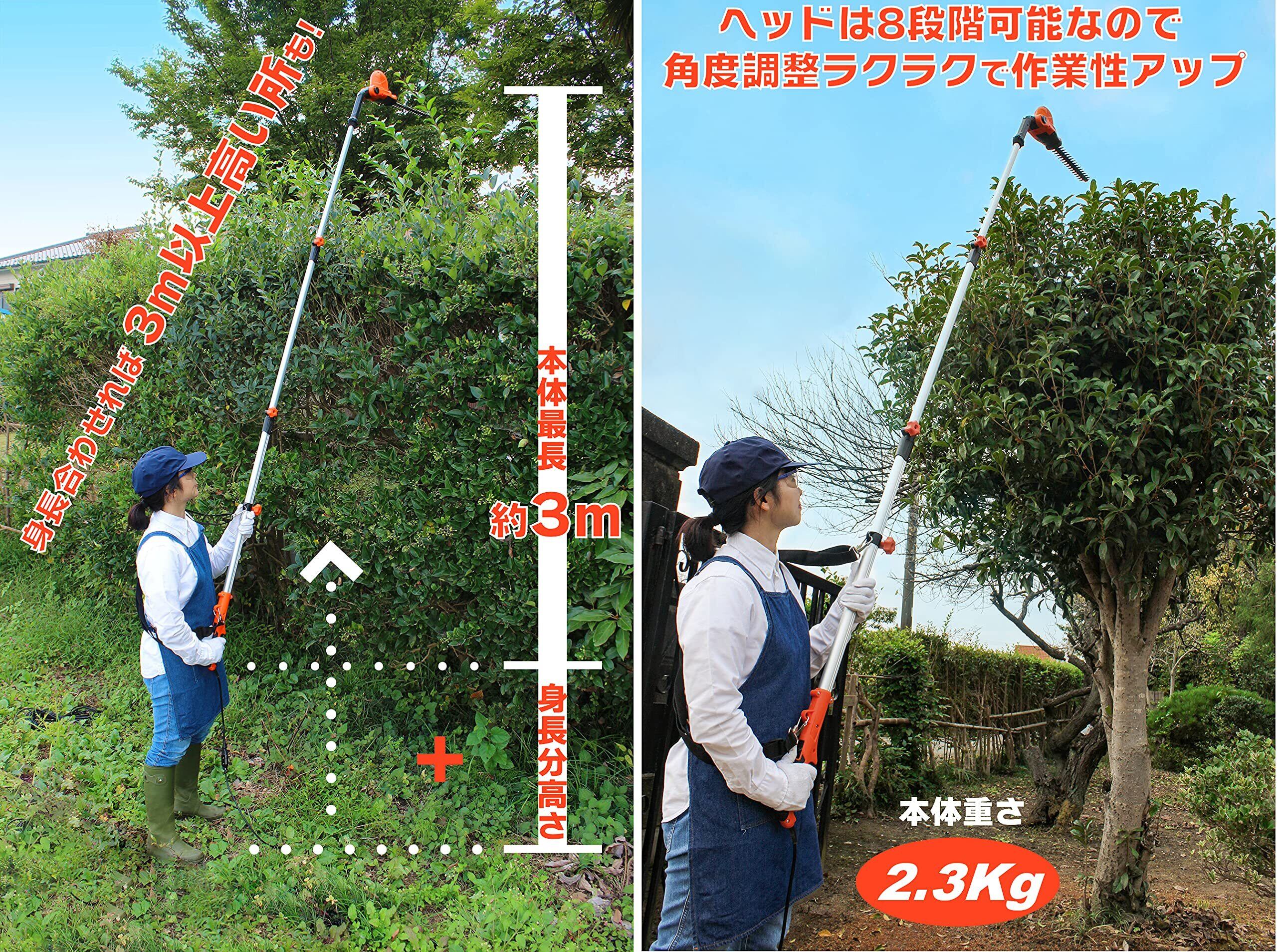 女性も軽々作業、100V動力工具軽量化する構造により本体2.3Kg(電源コード含まず)で連続使用が可能です。刈る所に合わせてヘッド角度8段調節可能、手が届きづらい更に高い枝葉も簡単生垣・切断可能、自由自在に伸びた枝葉を切断整理ができます。
