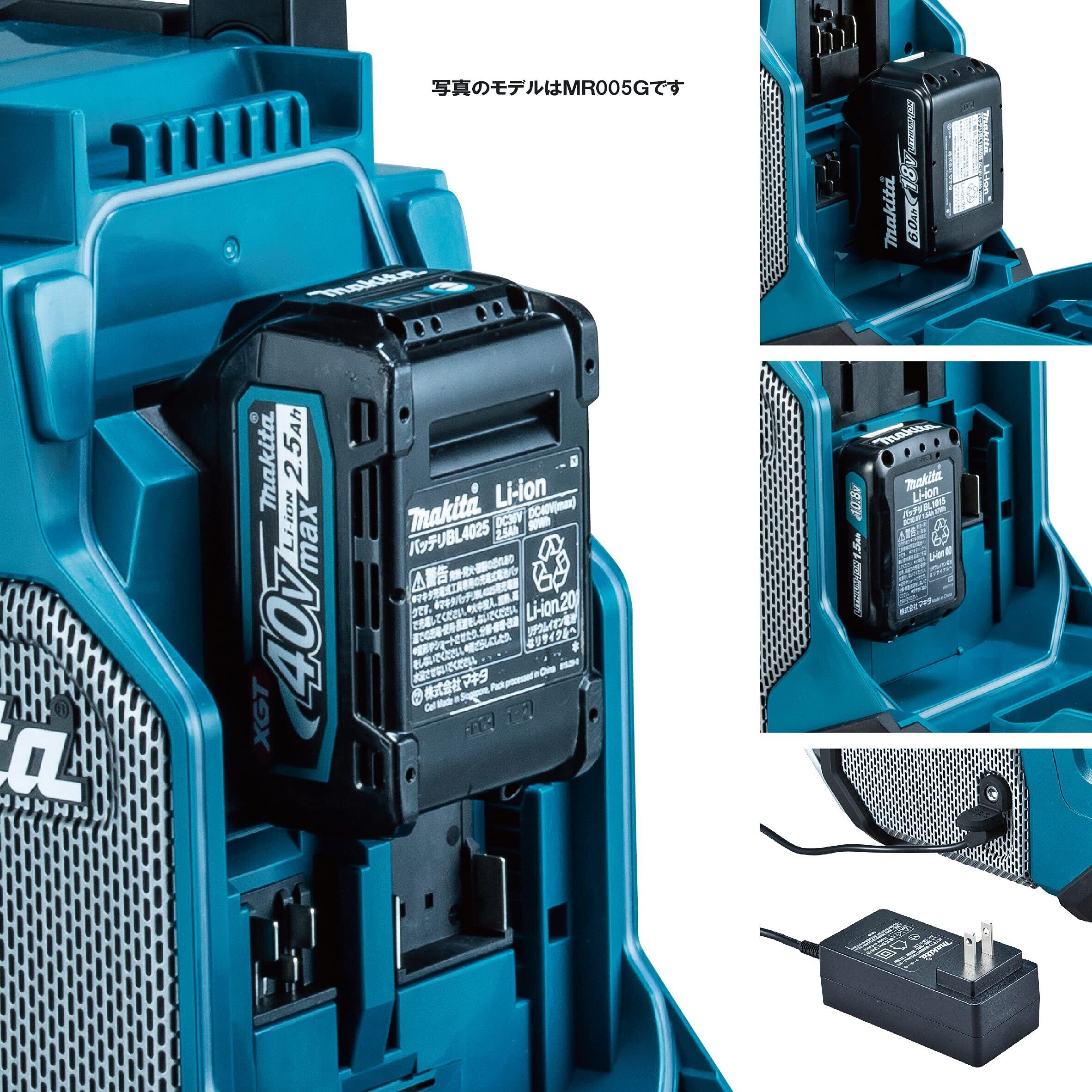 スライド式Li-ionバッテリ仕様。バッテリ・充電器別売、ACアダプタ付属。周波数帯域:FM76~108MHz/AM522~1,710kHz。アンテナ:FM内蔵ハンドル/AM内蔵フェライトバー。スピーカ左右89mm×2個。入力端子AUX IN(φ3.5mm)。使用可能バッテリ・電源:バッテリ10.8V(スライド式)・14.4V・18V(ライトバッテリ除く)・40Vmax・AC100V