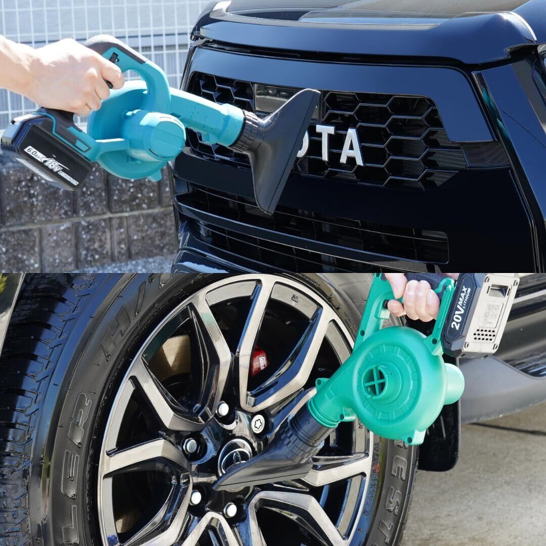 【️従来品の悩み】ブロワーに付属の純正ノズルは、丸い形状(円筒状)のため、洗車後に水を吹き飛ばす際に丸く広がってしまい、水がうまく切れないのが悩みでした。→スリット状に吹き出してワイパー効果で改善!