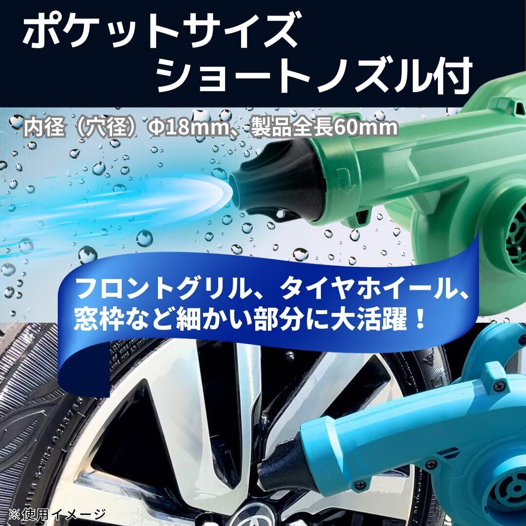 【️ショートノズル付き:内径(穴径)Φ18mm、製品全長60mm】超コンパクトなポケットサイズで取り回し快適なショートノズル付き。ブロワ付属の標準ノズルの代わりにご使用できます。スキマや細かい場所を狙い撃ち!フロントグリル、タイヤホイール、窓枠などの水滴を吹き飛ばします。