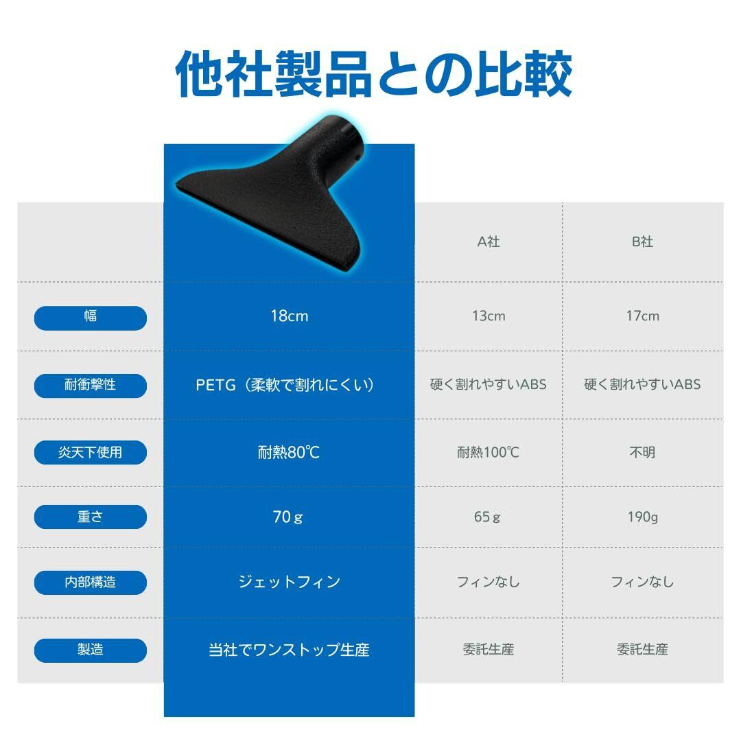 安心の日本製:洗車用水切りワイドノズル。特殊形状内部ジェットフィンにより短い全長でも両端まで強い風を吹き出し、18cmの幅広スリットで効率よく水滴を吹き飛ばします。