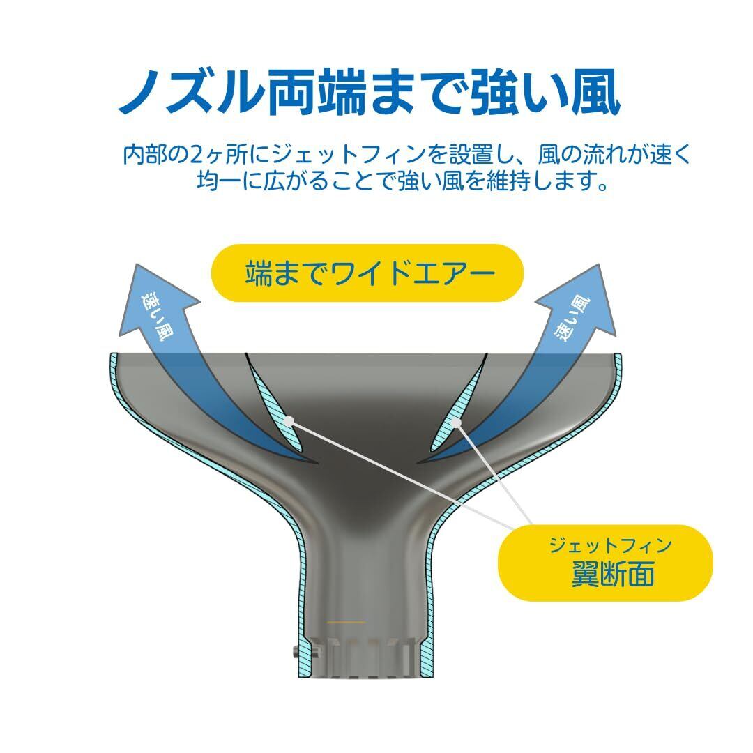 ノズル両端まで強い風:内部の2ヶ所にジェットフィンを設置し、風の流れが速く均一に広がることで強い風を維持します。