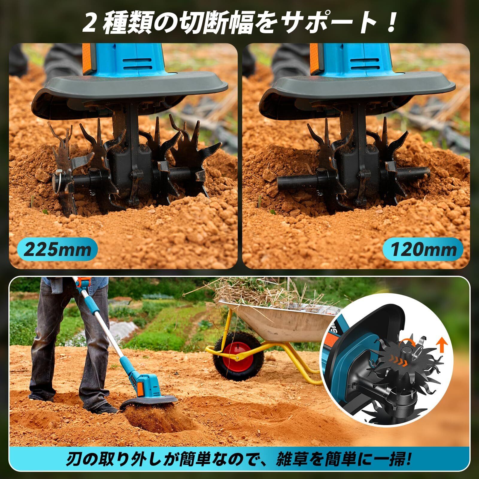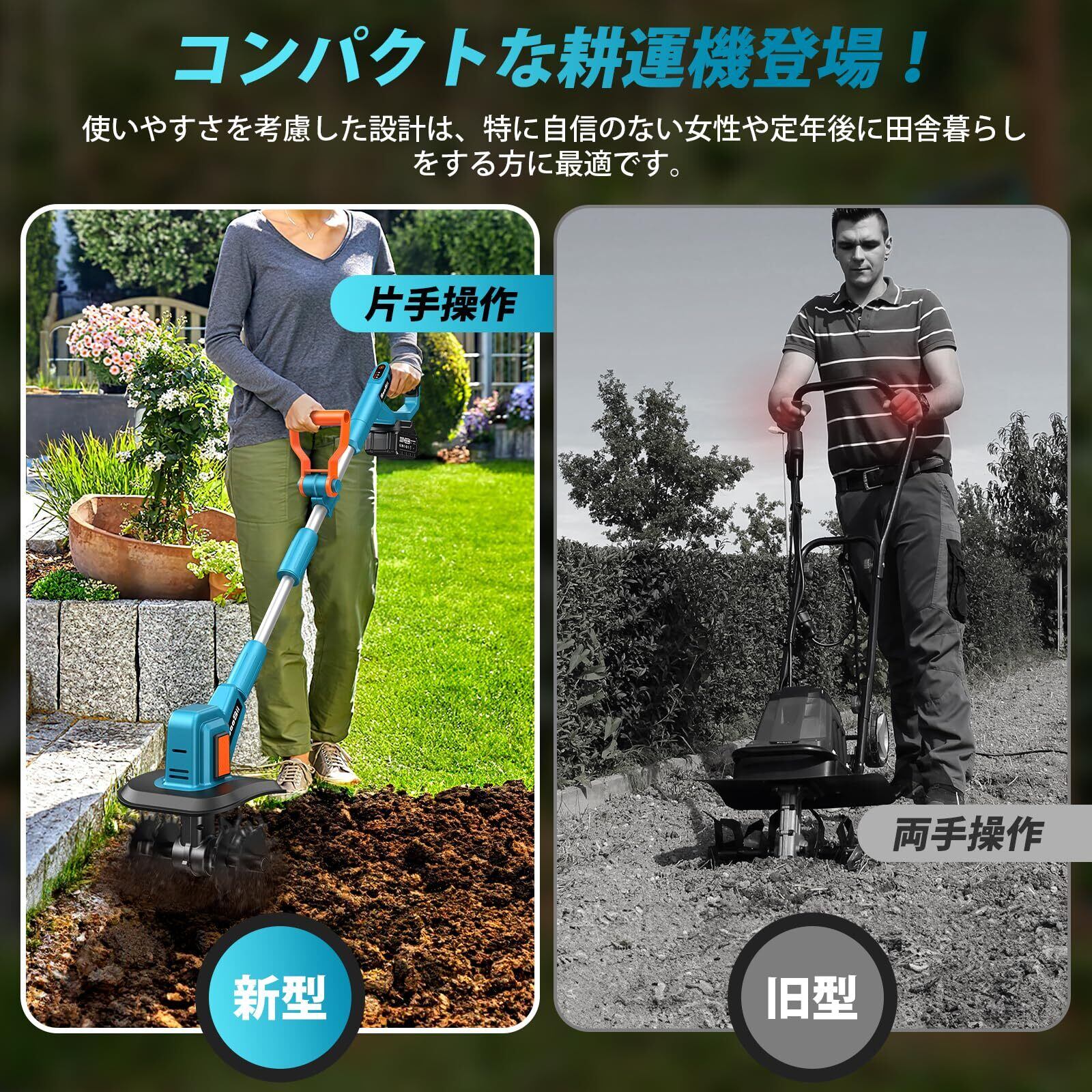 【コンパクト&静音設計 多用途に活躍】女性やシニアの方でも扱いやすい軽量設計で、省スペースでの作業も快適。エンジン式とは異なり、排気ガスや騒音が出ないため、住宅地の庭やビニールハウス内でも安心して使用できます。燃料補充やオイルも不要で、メンテナンスの手間を大幅に軽減。家庭菜園、ガーデニング、農地、畑など幅広い場面で、土の掘り起こしや雑草対策に最適な一台です。持ち運びにも便利な充電式。
