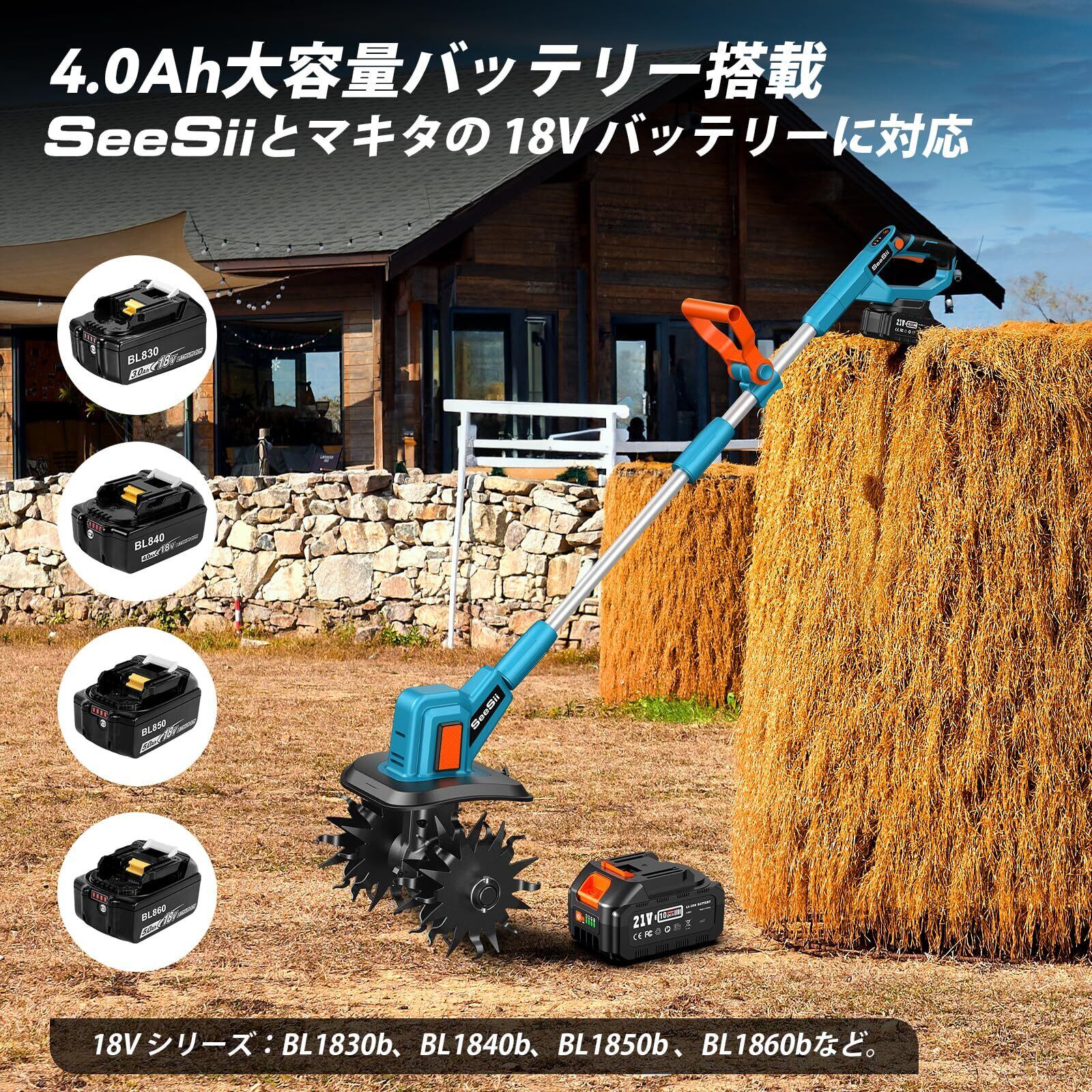 【2025新型】SEESII 電動耕運機 家庭用 耕うん機 充電式ミニ耕運機 コードレス 小型 種まき機 3段階変速 4 枚刃 強力 ハイパワー 耕うん機 畑 菜園 耕す 農機具 耕運幅225mm マキタ 18v バッテリー 4.0Ahバッテリ・日本語説明書付き