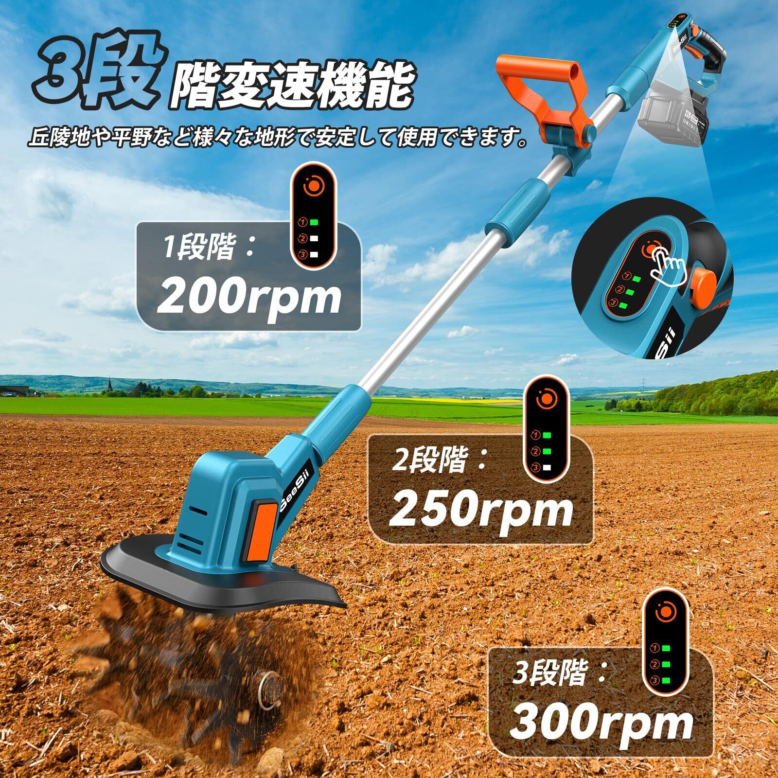 【2025年最新改良モデル 電動耕うん機 K18】️ 改良ポイント①:3段階変速機能を搭載。作業環境に応じて「低速・中速・高速(200/250/300rpm)」の3モードを選択可能で、作業効率が大幅に向上します。️ 改良ポイント②:取り外し可能な耕うん刃4枚を標準装備し、耕うん幅は最大225mmに対応。広範囲の土壌を効率よく耕せます。️ 改良ポイント③:誤作動を防ぐ安全ロック機能を新搭載。作動時にはロックボタンとスイッチの同時押しが必要で、安全性がさらに向上。️ 改良ポイント④:調節可能な補助ハンドル付属。用途や使用者の体格に応じて角度・位置の調整が可能で、長時間の作業も快適に。