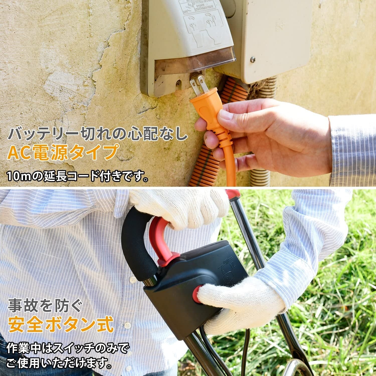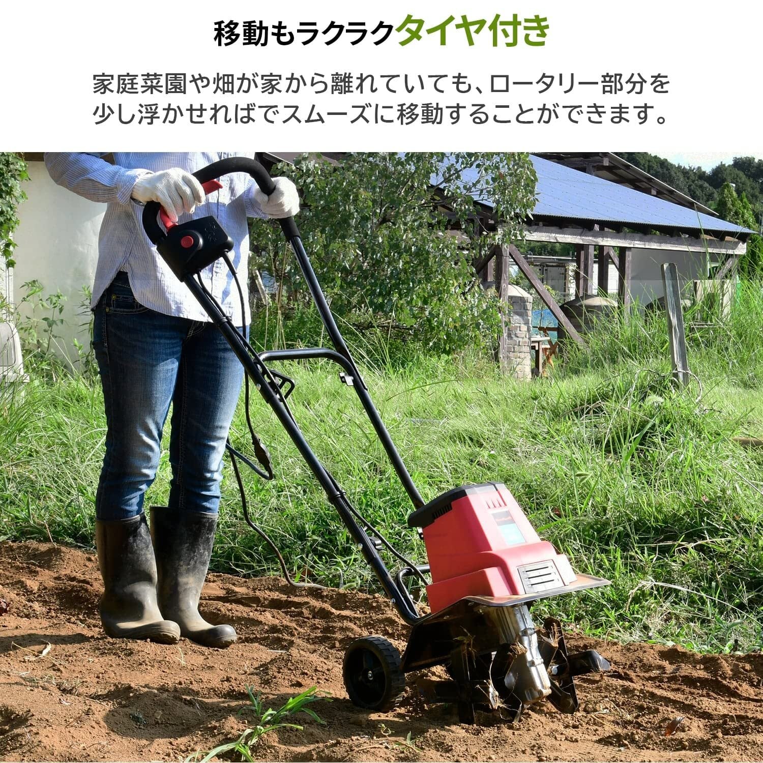 【仕様】サイズ:幅38×奥行105×高さ101cm/重量:約9.5kg/材質:スチール、樹脂/電圧:AC100V 50/60Hz /電流:11.5A/消費電力:1050W/耕幅:約300mm/耕刃サイズ:200mm/回転数:320min-1/定格時間:30分/コード長さ:0.35m※別途、10m延長コードが付属しています/耕うん目安面積:約20坪(約66平方メートル)/耕うん深さ:約10-12cm/騒音値:86dB/付属品:本体一式×1、コードフック×1、コードクリップ×2、延長コード10m×1