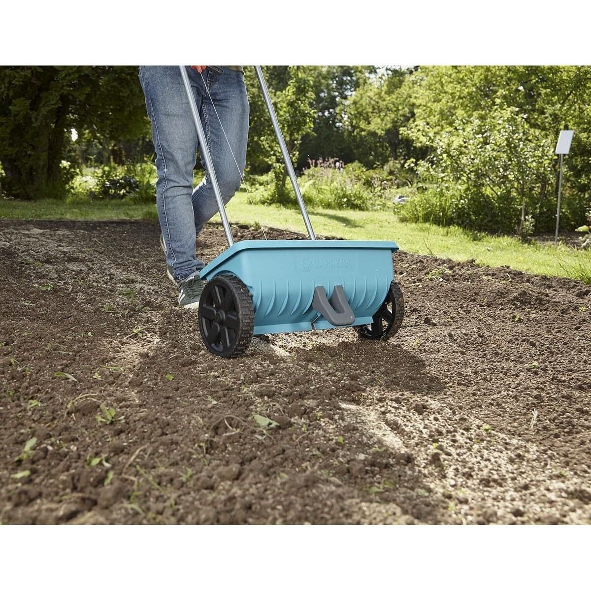 GARDENA 散布機 Lサイズ (45cm幅 12.5L) ~ 最大範囲400㎡での肥料や道路用塩や砂利の配布に便利な散布機。持ち手ハンドルに装着された開閉機能、散布量の調整も可能。 スライドカバーはシーリングリップが備えてあり、散布容器をしっかりと閉じ使用後に材料漏れしない。 特殊な散布ローラーは、散布材料を均一に、正確に、必要な領域にのみ分散させる。散布機のお手入れは水で簡単に掃除可能。メーカー最大製品5年