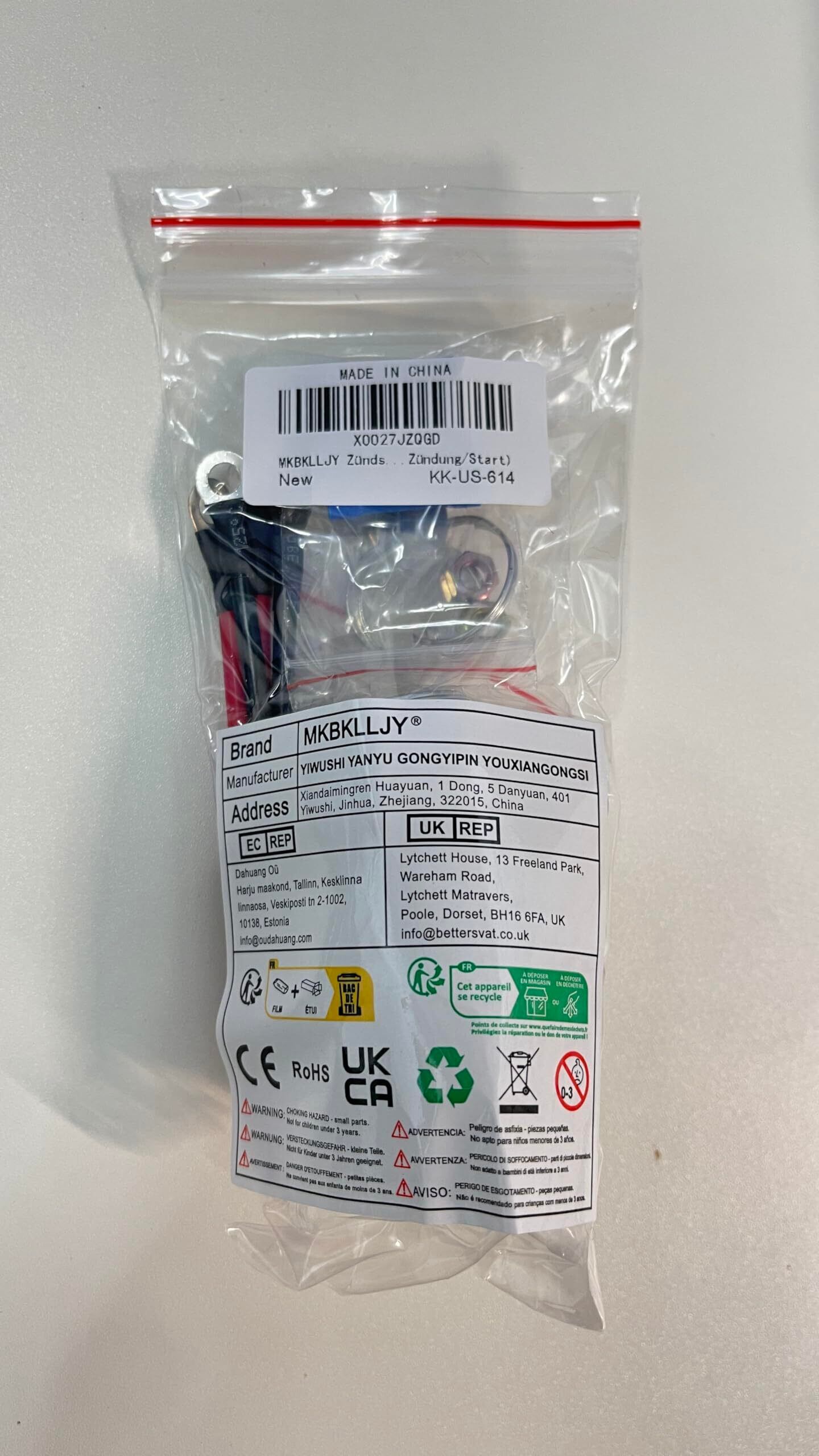 【パッケージ内容】イグニッションキースイッチ1個、キー2個、OT2.5-5端子線2個 (黒)、OT2.5-5端子線2個 (赤)、青コールドプレスコネクタ4個。
