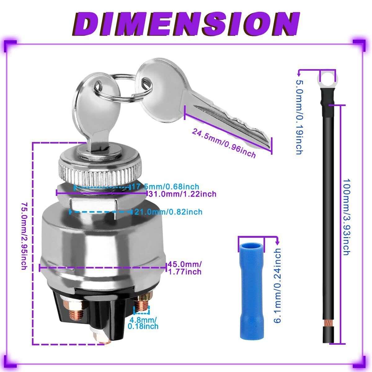 【寸法】イグニッションキースイッチ: 45.0mm x 75.0mm /1.77インチ x 2.95インチ (幅 x 高さ)。ねじ径: 17.5mm/0.68インチ; OT2.5-5 ブルー端子コネクタ径: 6.1mm/0.24インチ; 端子ラグ: 5.0mm/0.19インチ; ケーブル長: 100mm/3.93インチ; ワイヤゲージ: 14AWG。