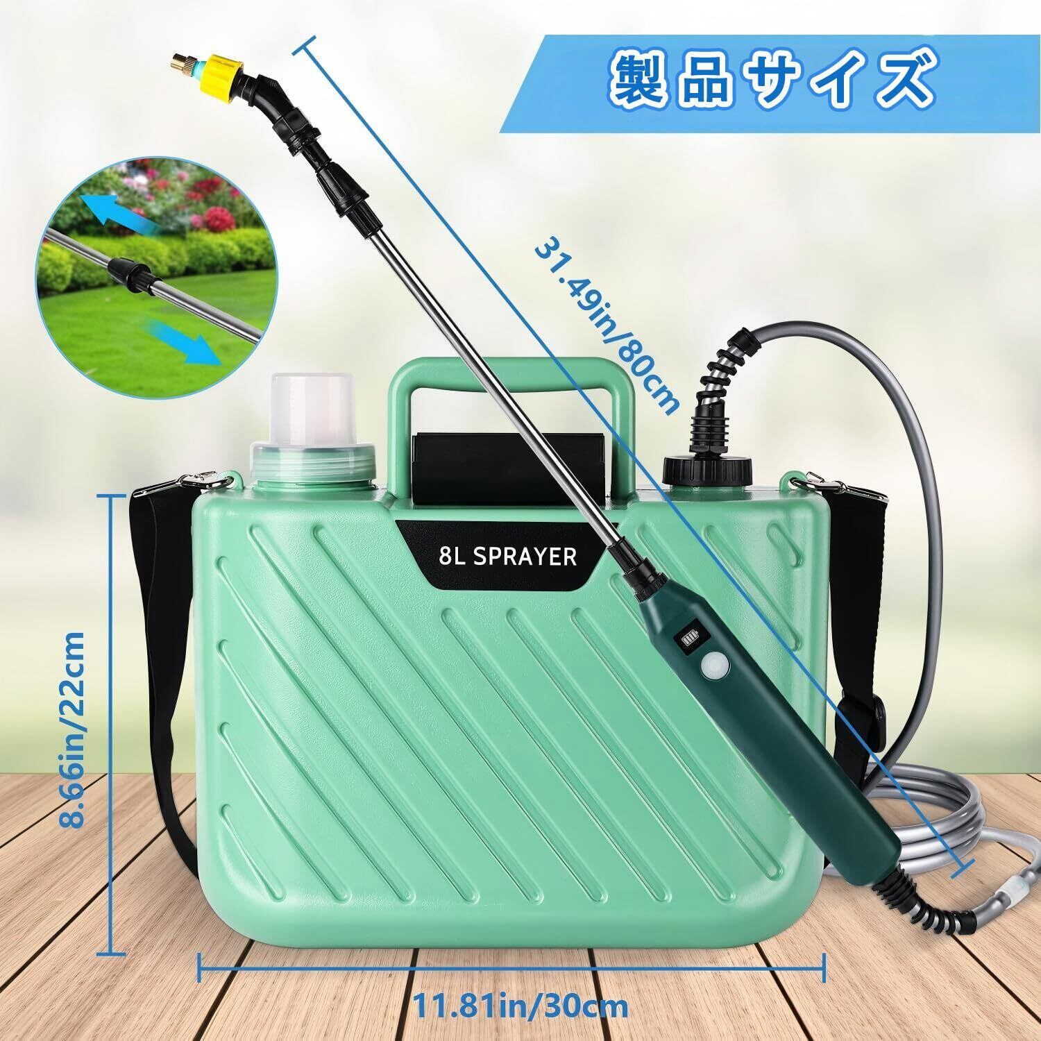 【8L電動噴霧器】使いにくい散水器とはもうお別れ!この電動噴霧器は、あなたが待ち望んでいた理想の園芸ツールです。芝生や庭園用のこのスプレイヤーは、優れた耐久性、あらゆる庭のレイアウトに対応できる調整機能、そしてガーデニングを変えるほどの利便性を兼ね備えています。噴霧器にはバッテリーハンドルと自吸式ウォーターポンプが装備されており、ハンドルのボタンを押すだけでスプレーを制御できます。