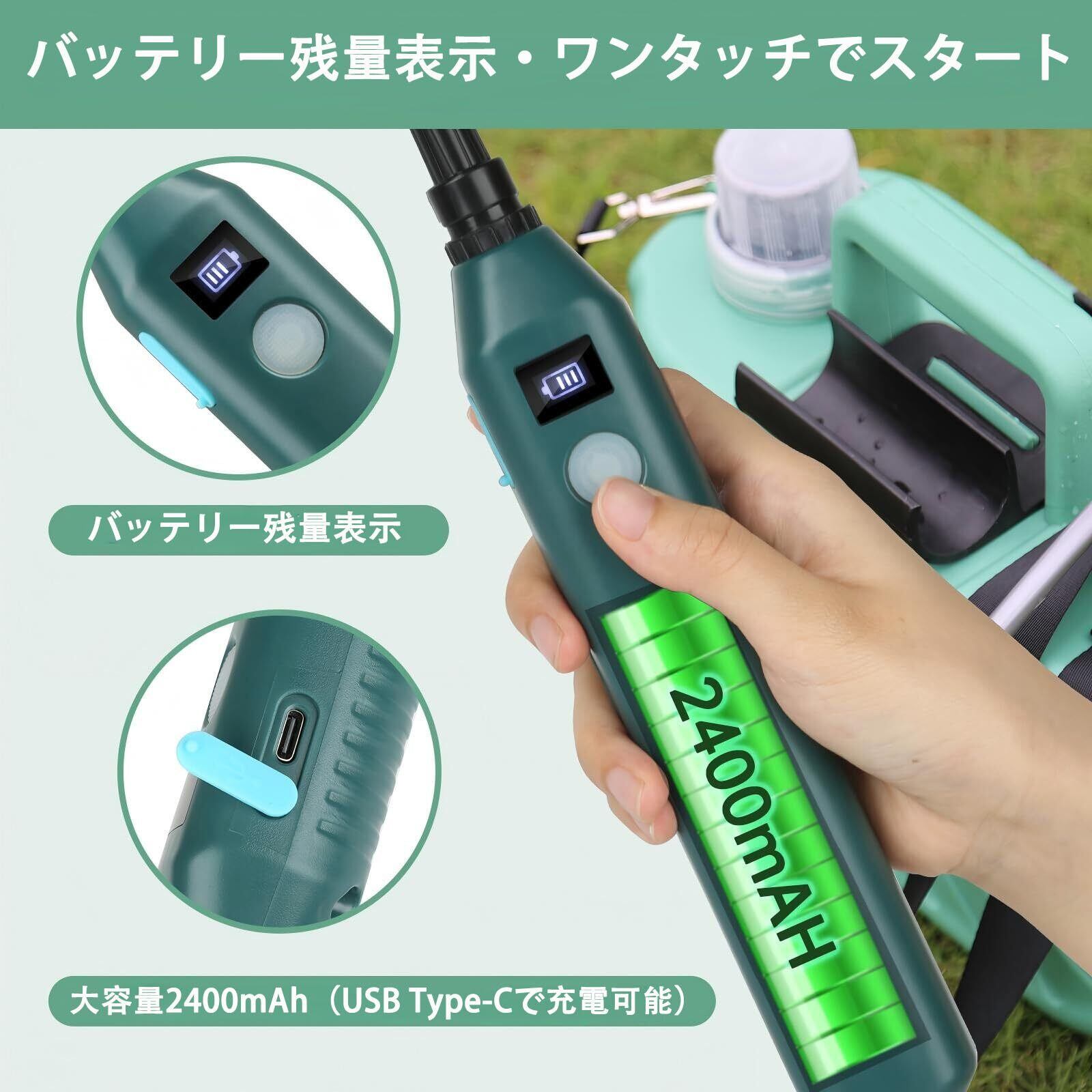 噴霧器 充電式 8L ポータブル除草剤 3種類ノズル付き 伸縮式パイプ(32-60cm調整可能) 肩掛け/手持ち両用 自動噴霧 ポータブル除草剤 2時間連続使用可能 除草剤散布 防除 園芸 家庭掃除用 日本語説明書付属 TypeC充電 (緑色(8L))