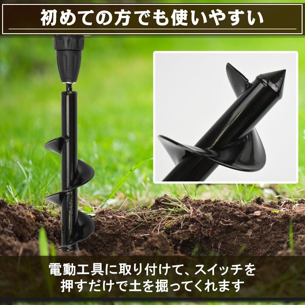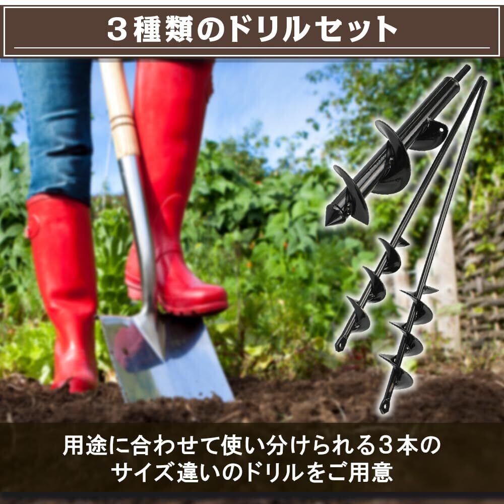 ドリルには頑丈な素材を採用しているため、手作業では難しい硬い土壌にも綺麗な穴を開けることができます。開けたい穴のサイズによってドリルを使い分けられるところも嬉しいポイントです。