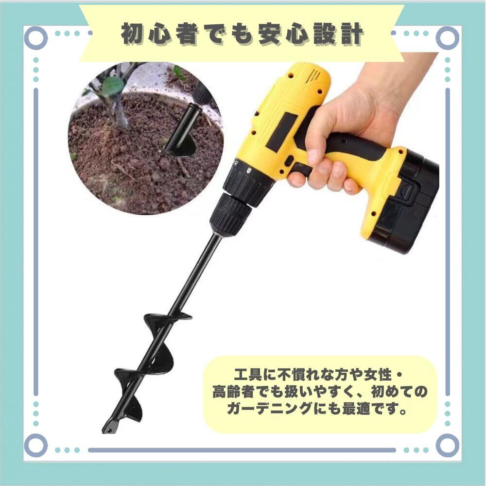 【初心者でも安心設計】工具に不慣れな方や女性・高齢者でも扱いやすく、初めてのガーデニングにも最適です。【身体にやさしい構造】ドリルの刃先が近く、作業時に無理な姿勢を取らずに済むため、腰への負担も大幅に軽減します。【簡単装着で即作業】六角軸の電動ドリルに差し込むだけで準備完了!誰でもすぐに使えて時短にもつながります。【DIY・ガーデニング両対応】柱の設置から鉢植え用の穴掘り、土やモルタルの混合まで、家庭内の様々な作業に大活躍!【安心の・返金】もし商品にご満足頂けない場合、商品到着から30日間・返金対応させて頂きます。また、お困りごとがございましたら、メールサポートにて24時間日本人専任スタッフが対応致しますので、安心してお買い求めください。
