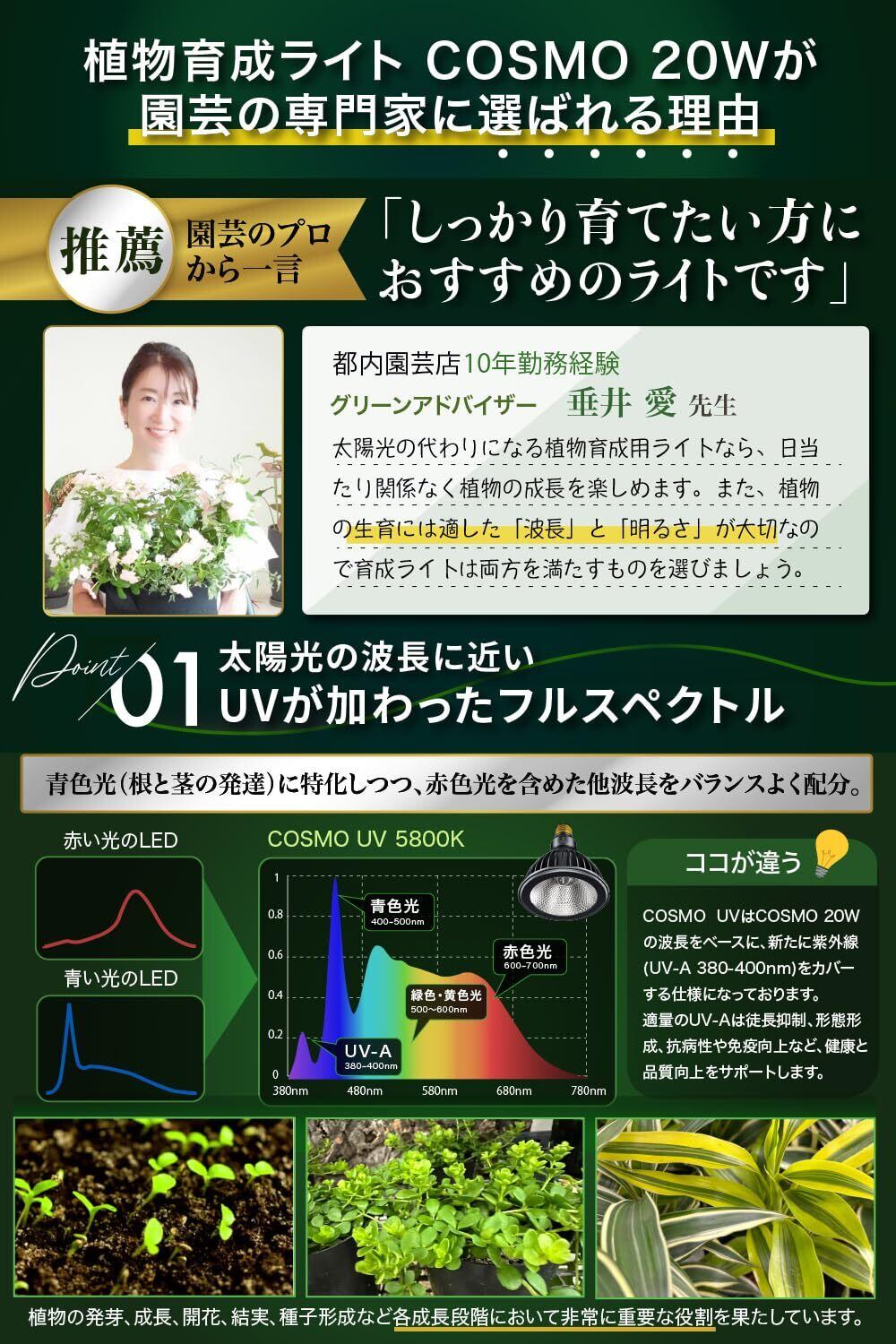 【グリーンアドバイザー推薦】BRIM(ブリム) COSMO UV 20W 植物育成ライト LED フルスペクトル 高PPFD 高力率 高演色性 植物用 省エネ設計 長寿命 E26口金 反射板&集光レンズ付き (COSMO UV (BK 白色系 5800K) | KSショップ