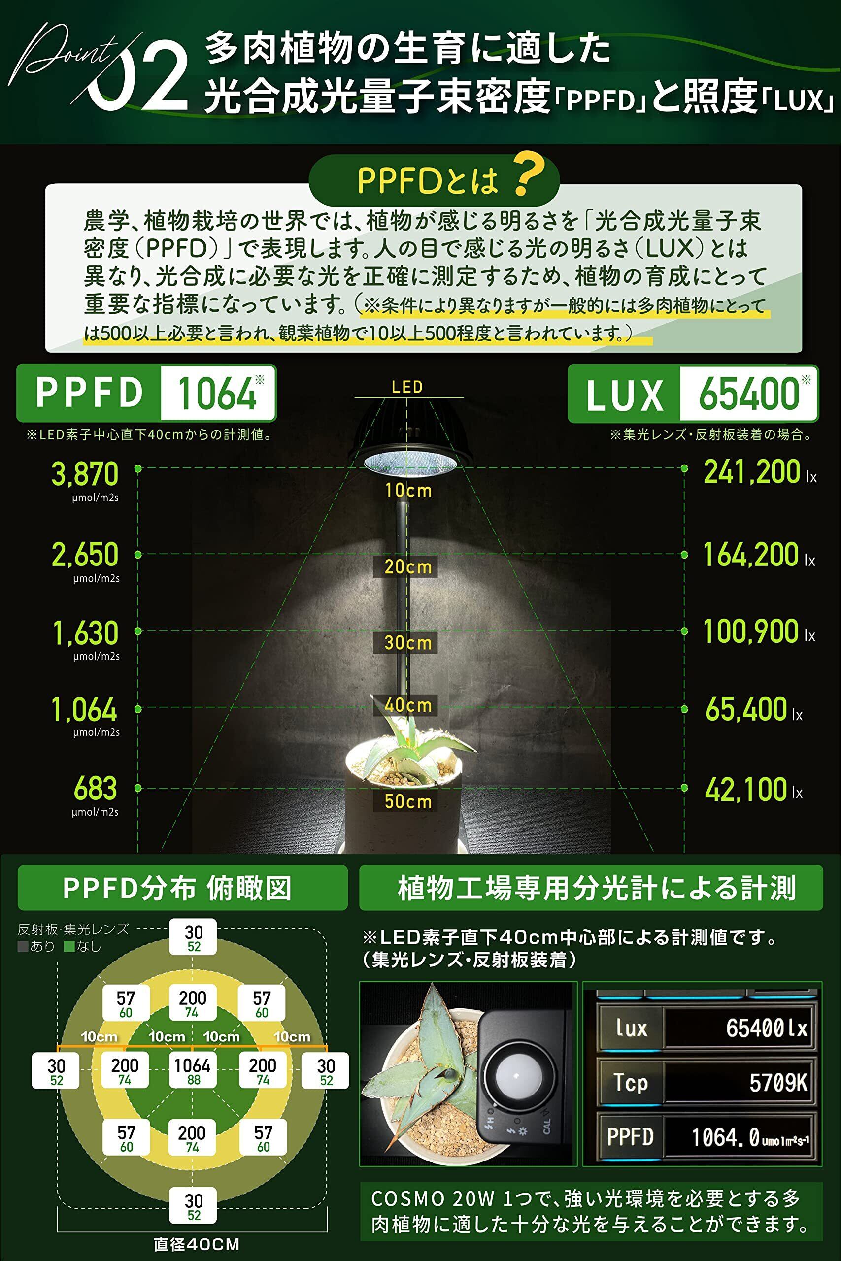 【高PPFDで質の高い植物育成】 COSMO 20W 植物育成ライトはPPFD値1,064、照度64,500(※LED素子直下距離約40cm)の非常に高い性能を持っており、室内でも屋外のように元気に育てることが可能です。冬に弱く日光を好む植物からほとんどの観葉植物まで幅広くに適しています。植物ライトを設置することで季節や天気に左右されず健康な状態を保つことができます。