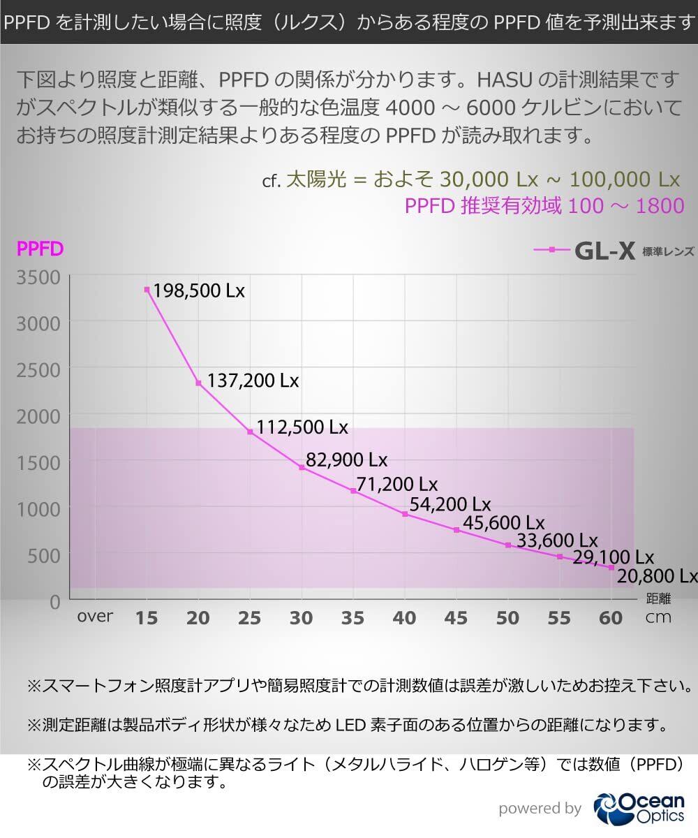 植物育成を想定した高密度フルスペクトルLEDは各距離でのPPFD値も高く植物の光合成をサポートします。