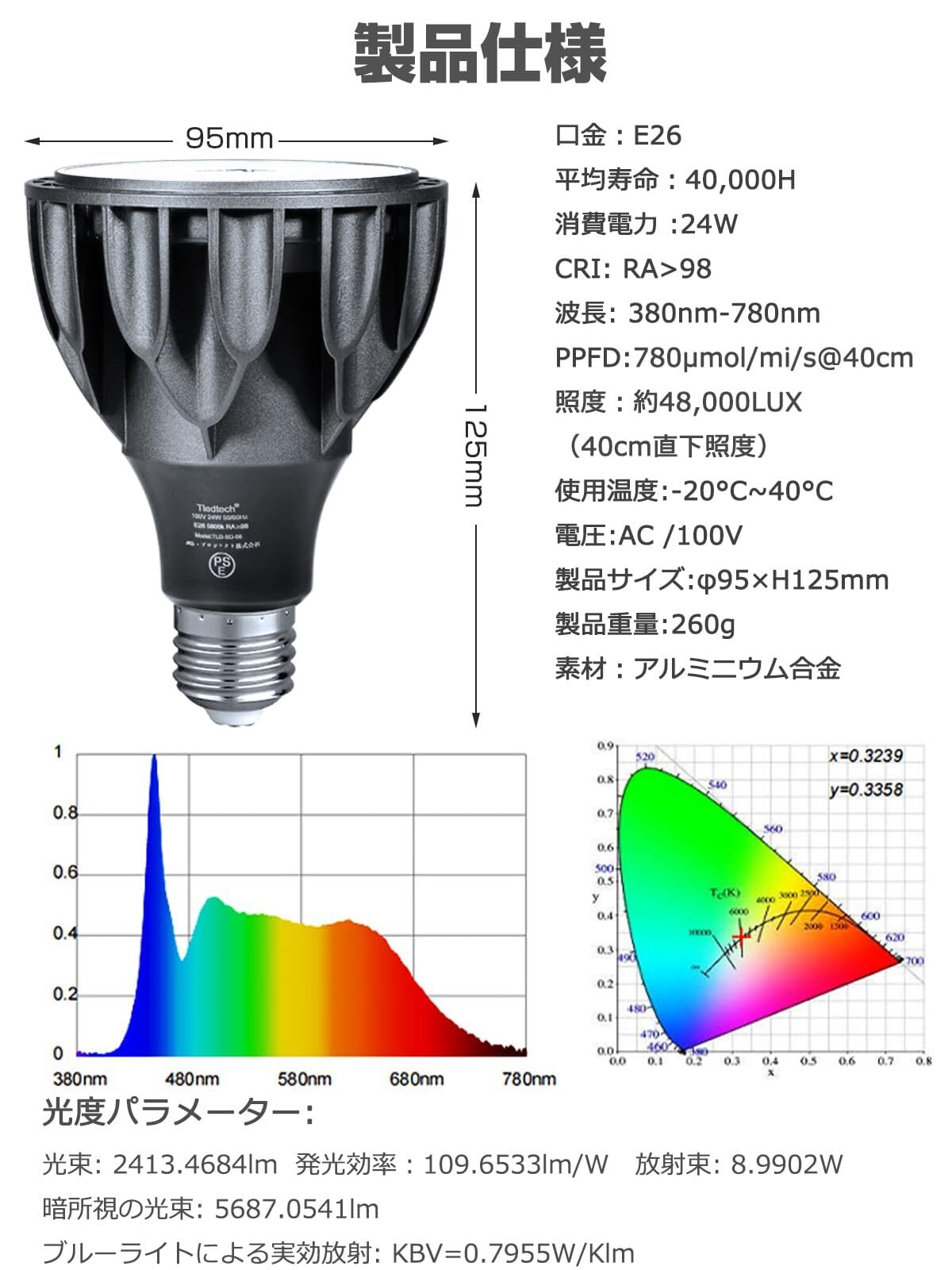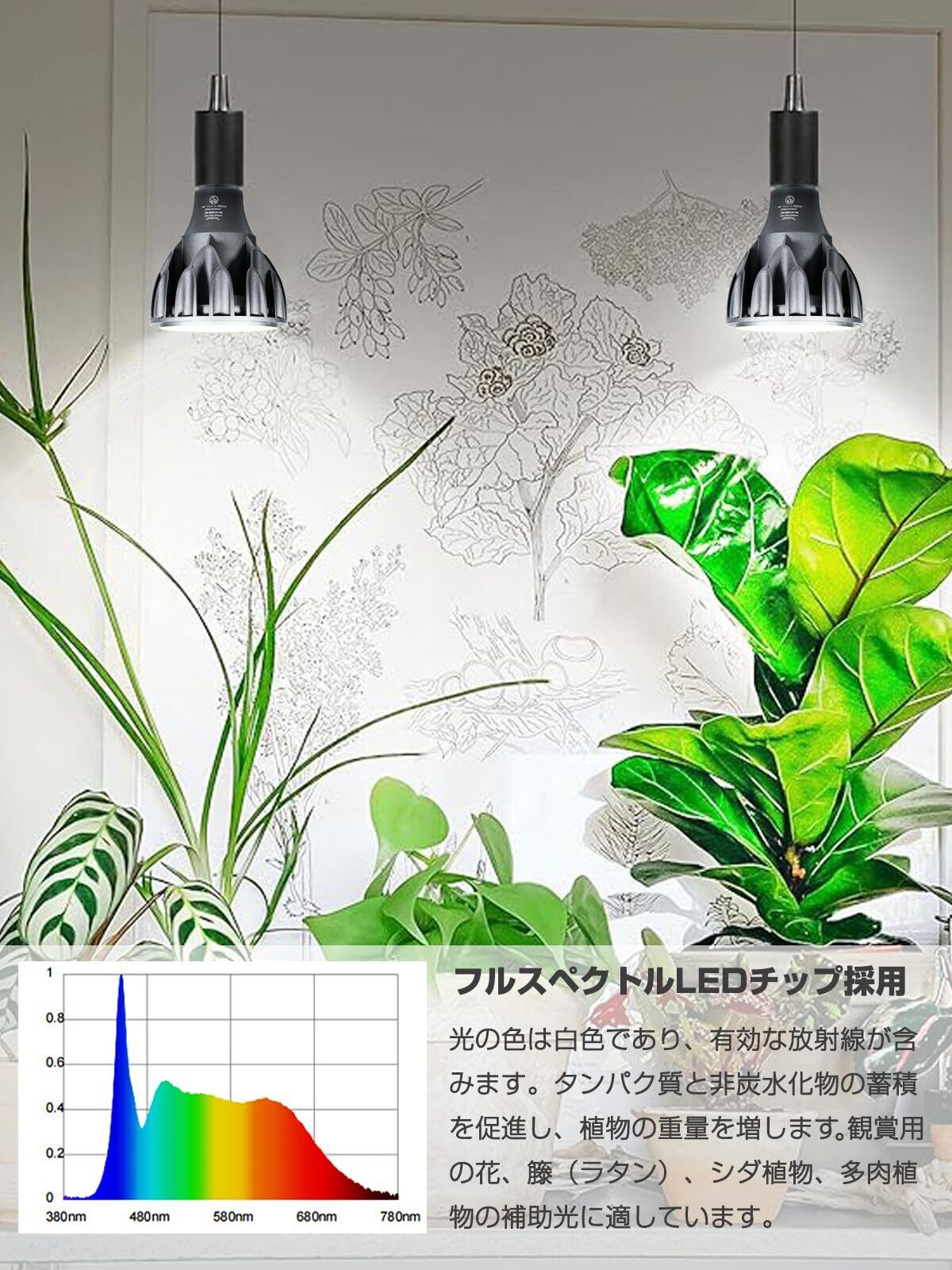 tledtech 24W 植物育成ライト LED E26口金 フルスペクトル 白色系 5800K 高PPFD 高力率 高演色性 植物用LEDライト 長寿命
