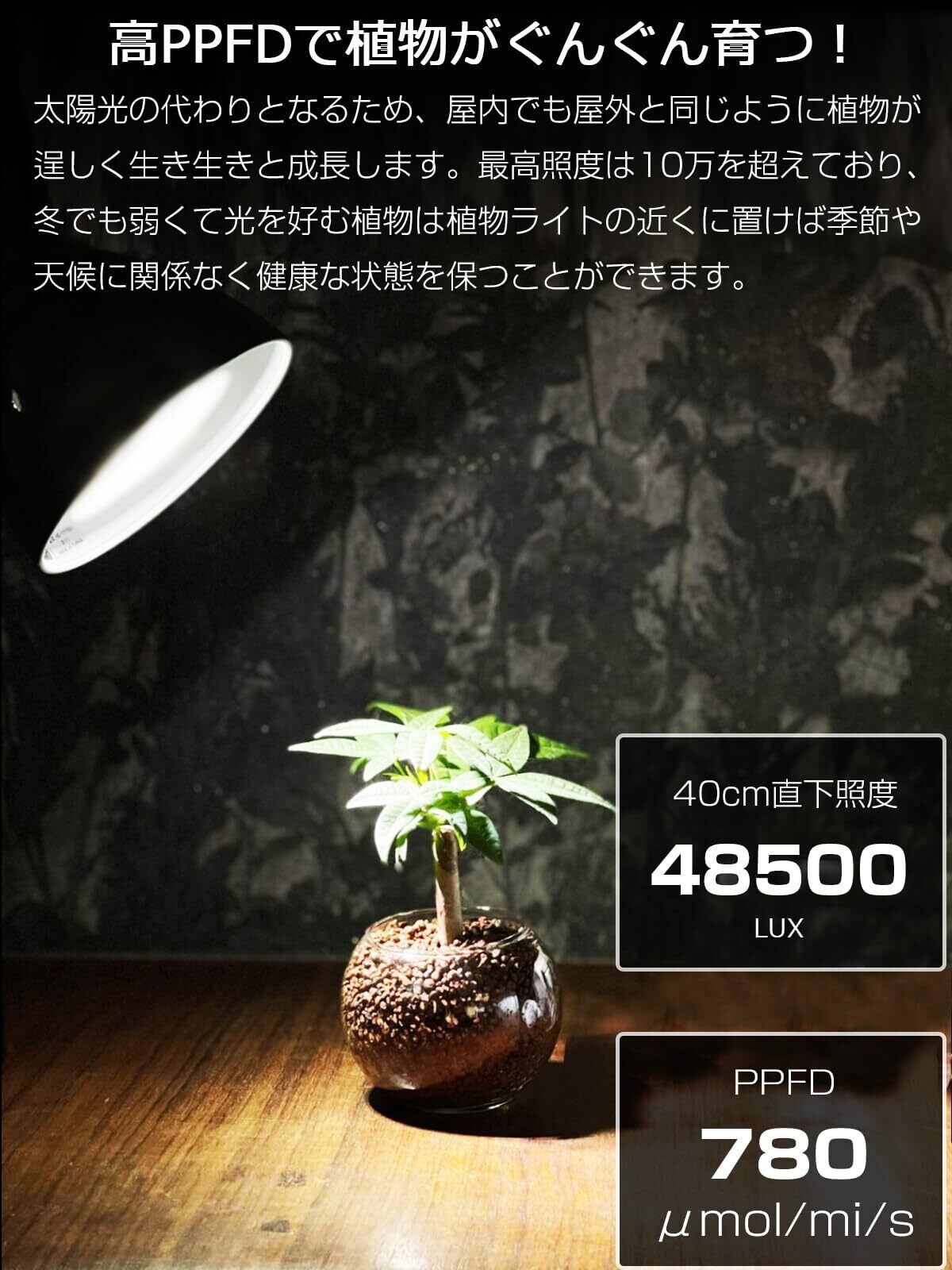 ꕥ【高PPFDでより良い植物育成が可能に】PPFD(光合成光量子束密度)値は780であり、照度は48,500(※LED素子直下距離約40cm)の非常に高い性能を備えておるの24W植物育成ライトは太陽光の代わりとなるため、屋内でも屋外と同じように植物が逞しく生き生きと成長します。最高照度は10万を超えており、冬でも弱くて光を好む植物は植物ライトの近くに置けば季節や天候に関係なく健康な状態を保つことができます。植物用補光LEDとしても十分な光量性能を搭載し、曇天、雨天、陰、屋内でも補光を強力サポートします。